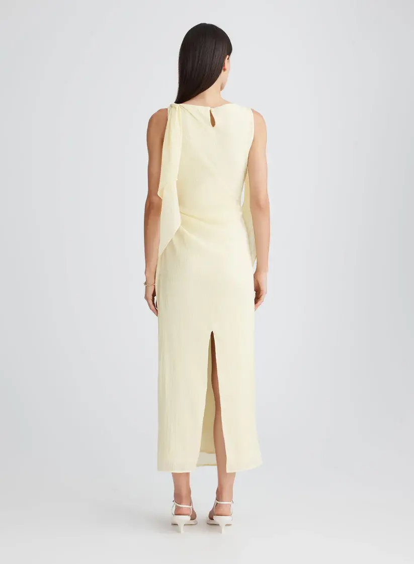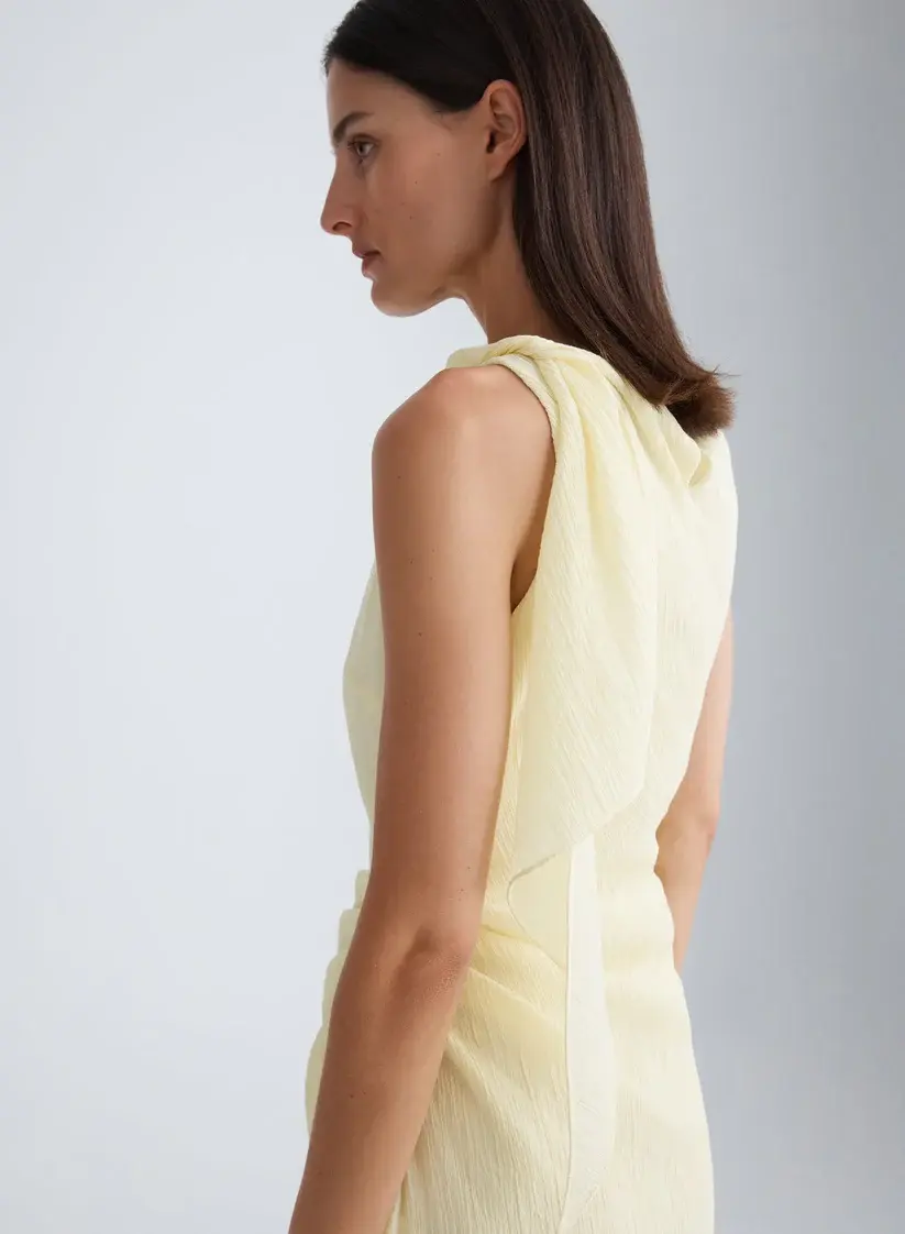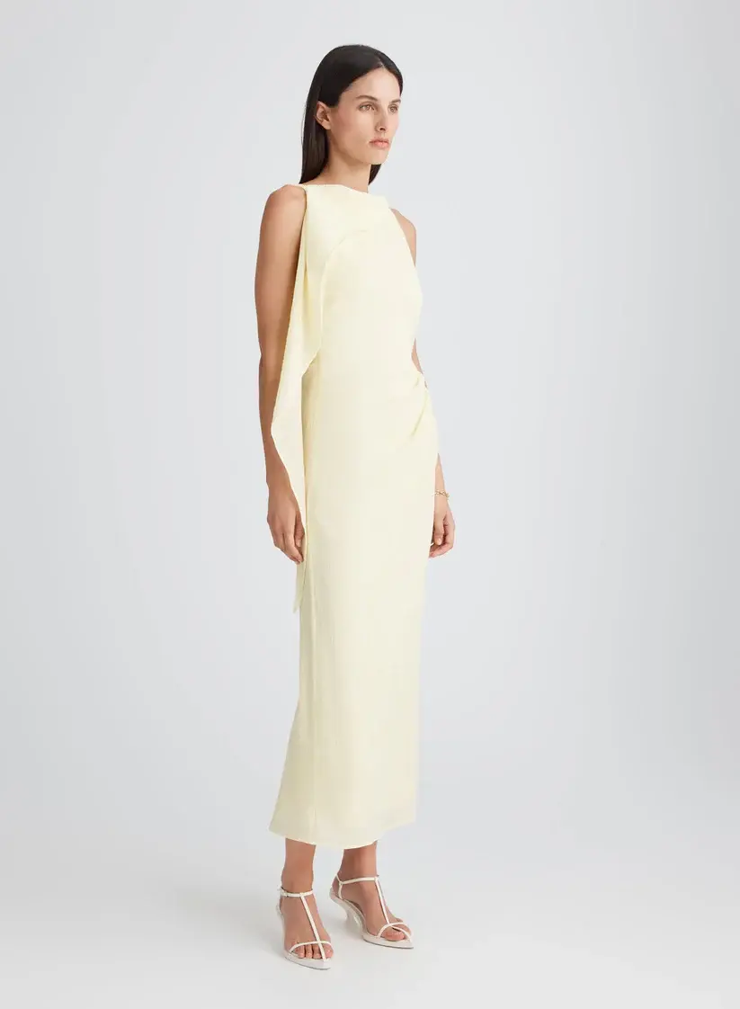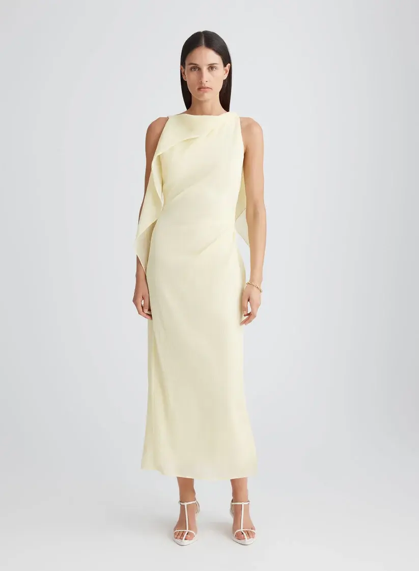 The Elissa Dress in Sorbet is a softly sculpted silhouette, defined by a fluid draped overlay and clean boat neckline. Crafted in lightweight cotton yoryu, it falls through a refined column shape with subtle waist tucks. Light and elevated, it is designed for effortless modern occasion dressing.