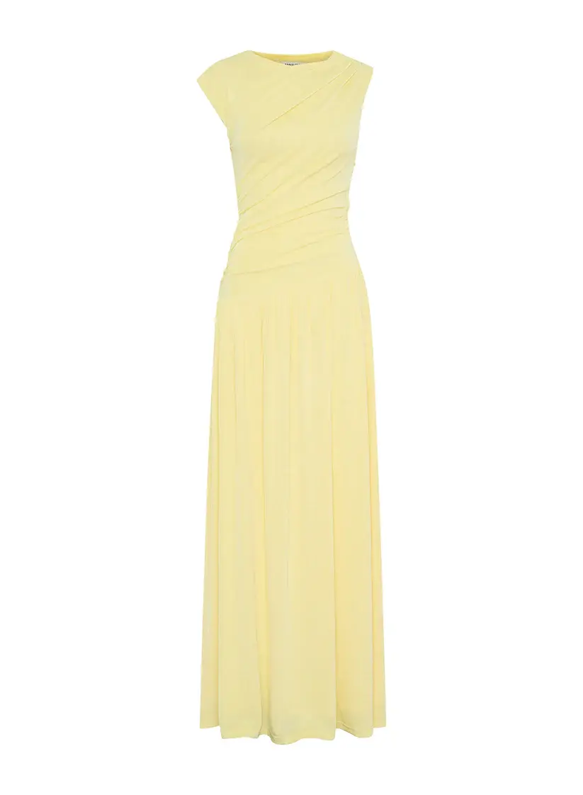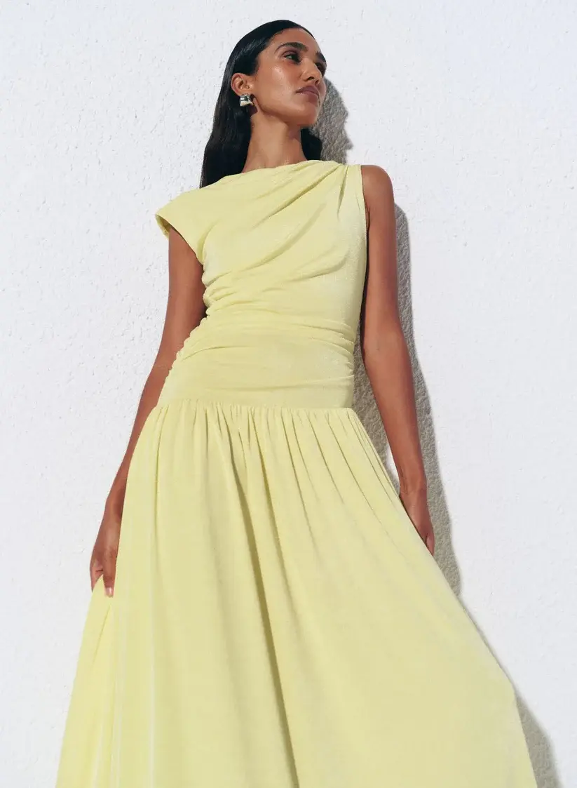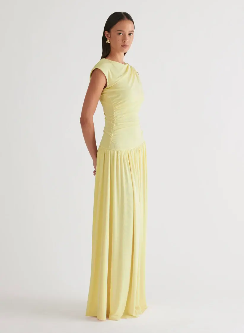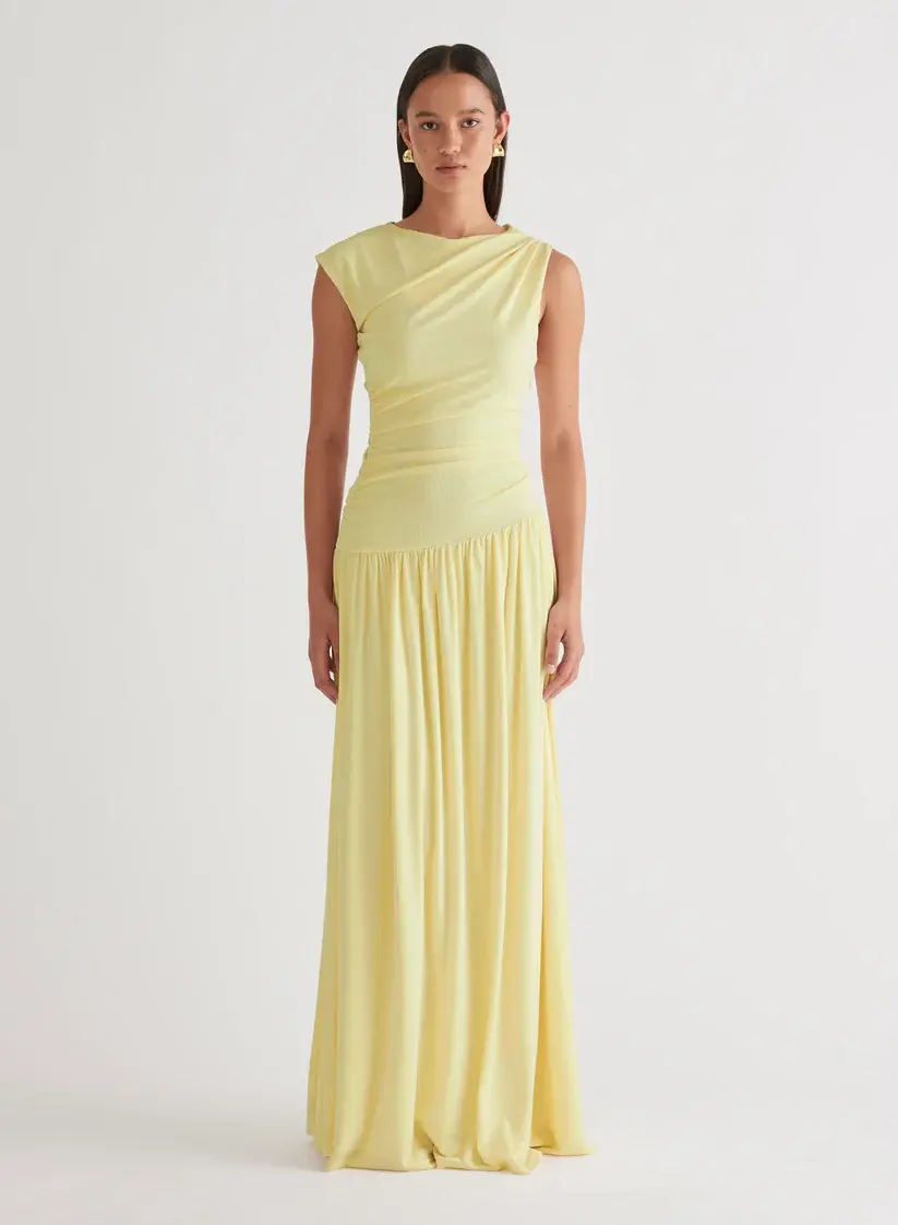 The Andie Dress in Limoncello is a stand out event gown. Cut in a luxurious soft jersey knit fabrication, the Andie Dress is detailed with an asymmetrical boat neckline with subtle ruching across the bodice. Finished with a gathered align skirt, fully lined for ease of wear.