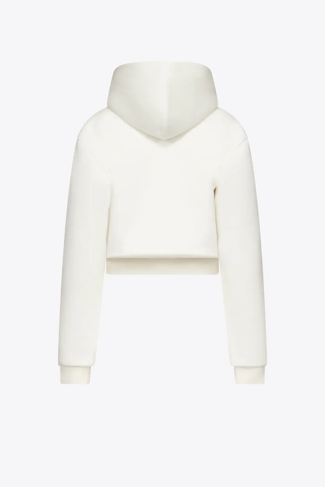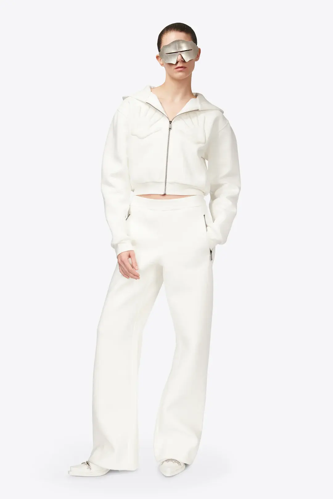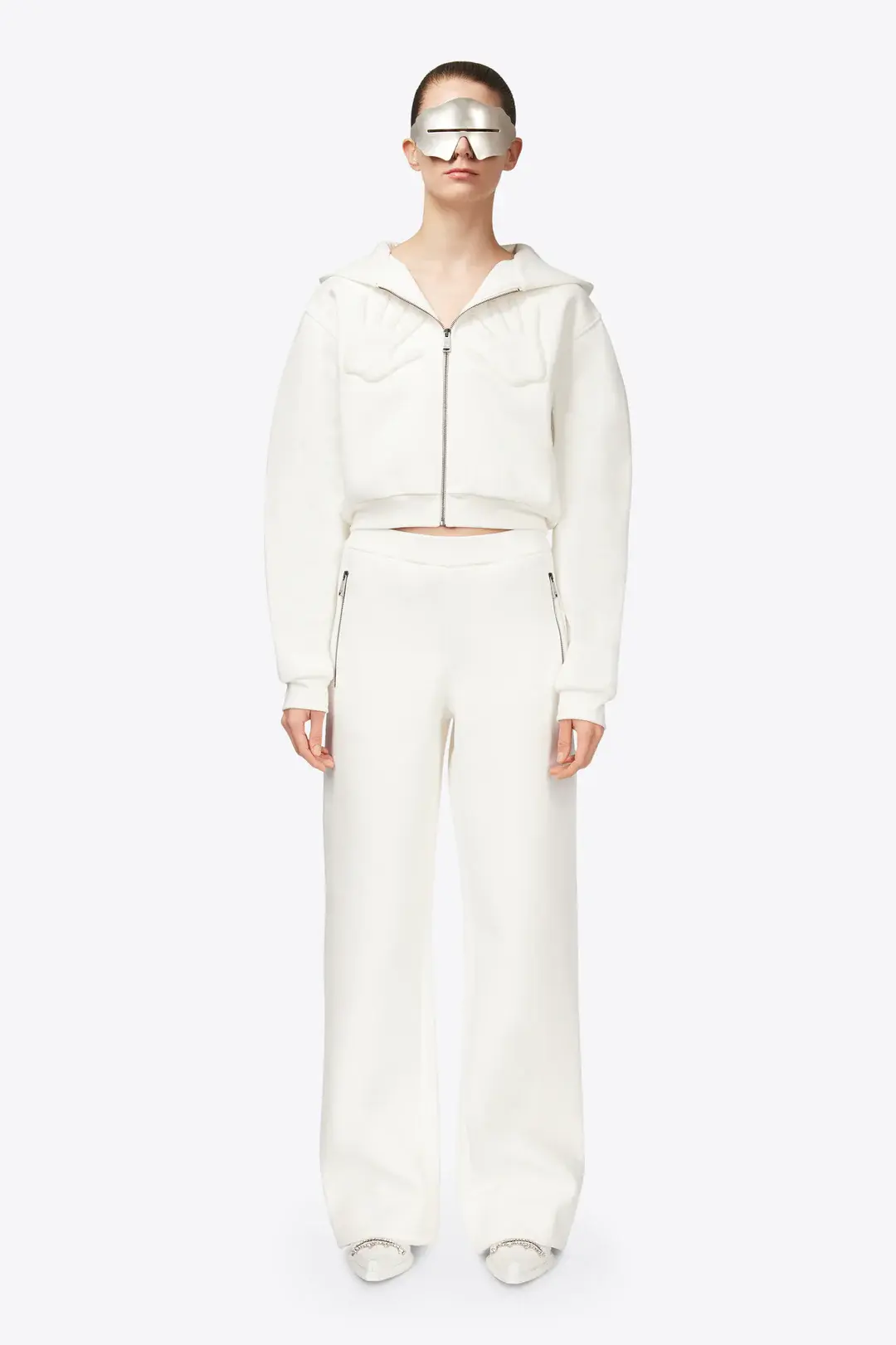 Scuba hoodie featuring embossed handprint at chest and front zipper. Available in Off White.