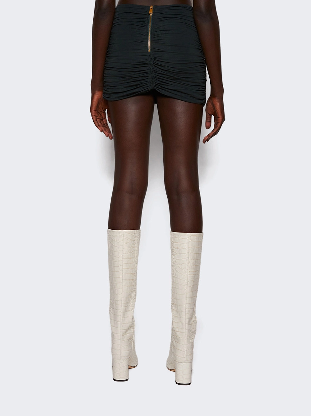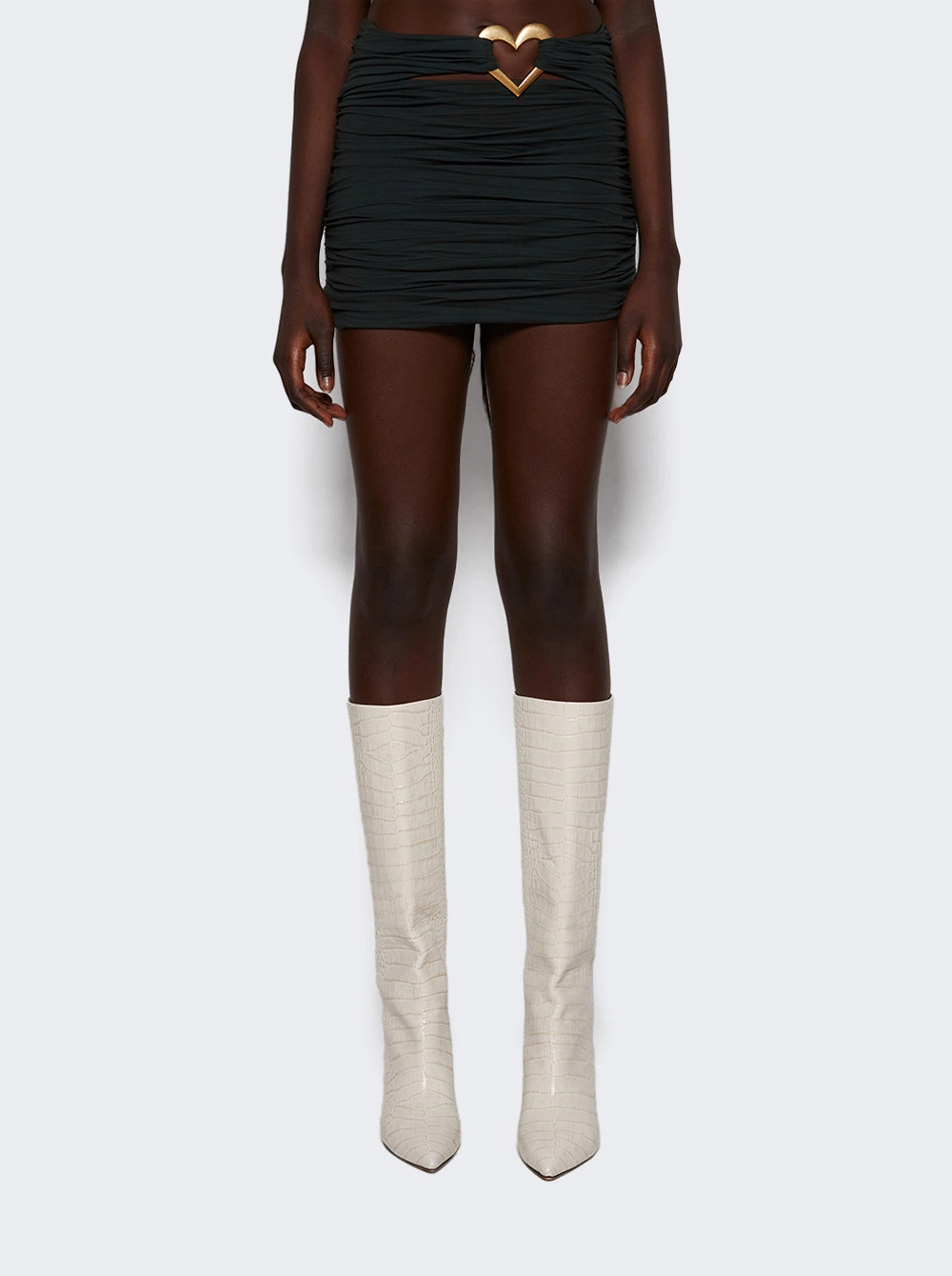 Ruched mini skirt of lightweight jersey draped around a brass heart jewel. Invizible zipper at center back. Available in Off White.