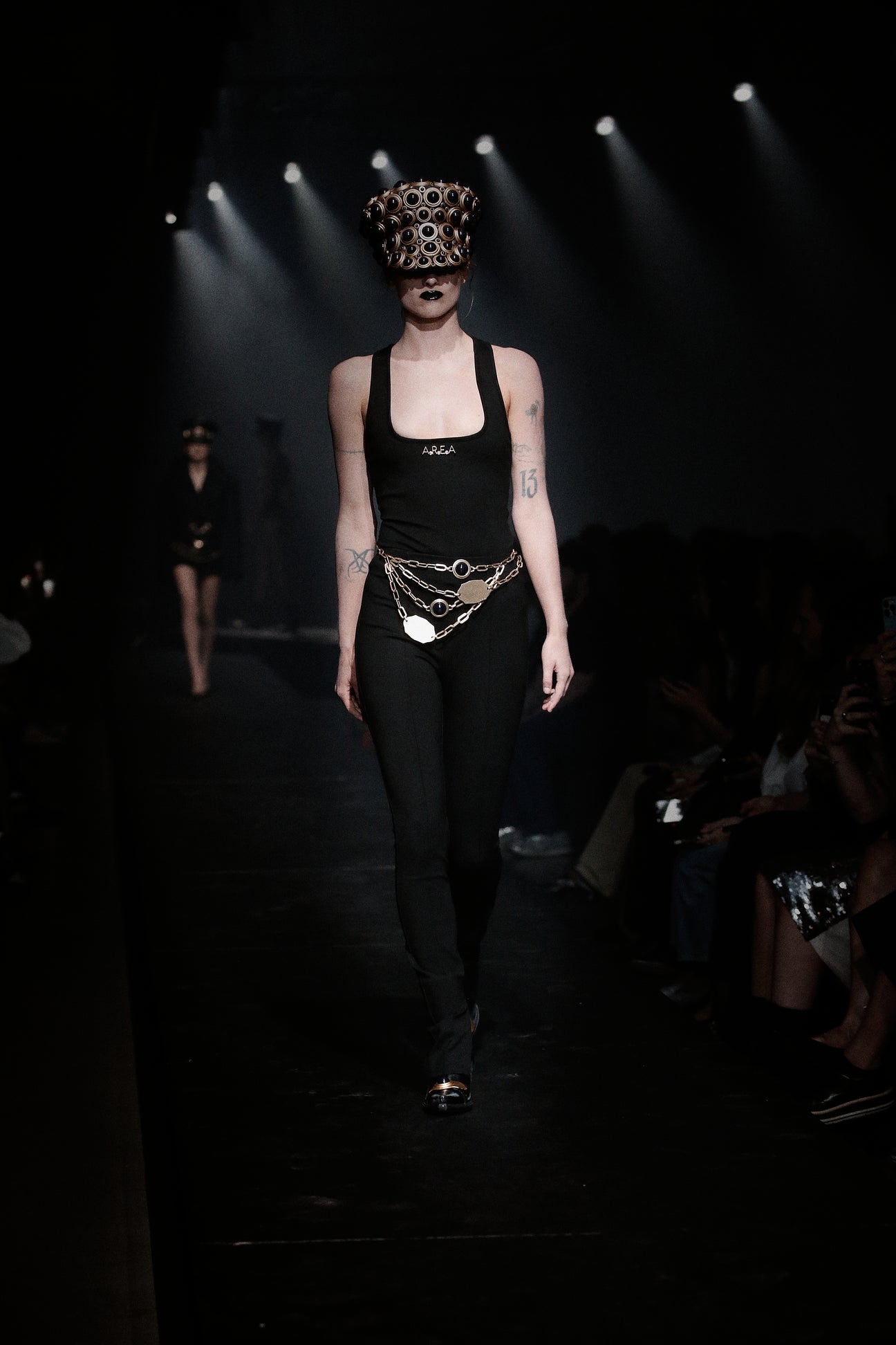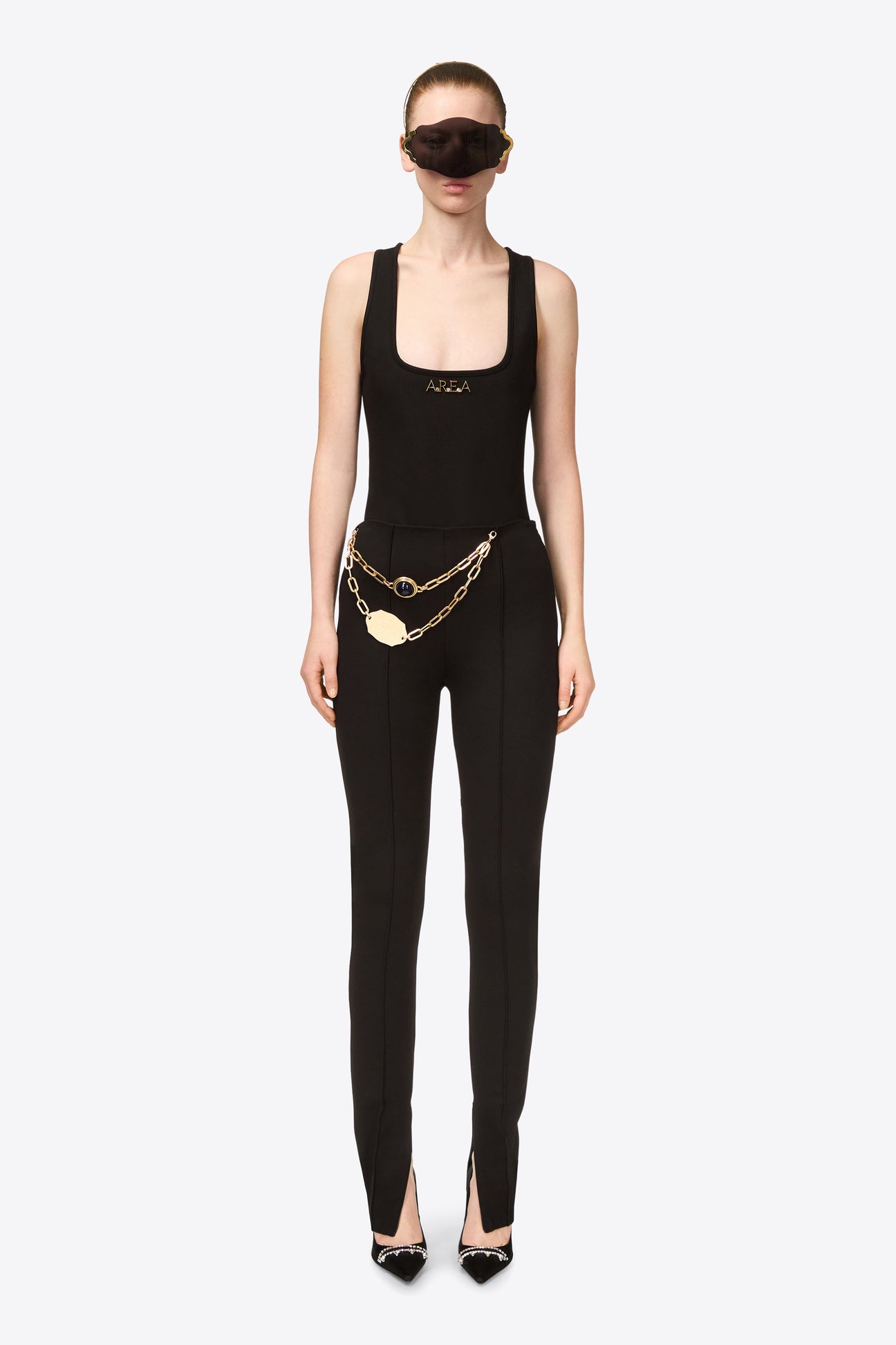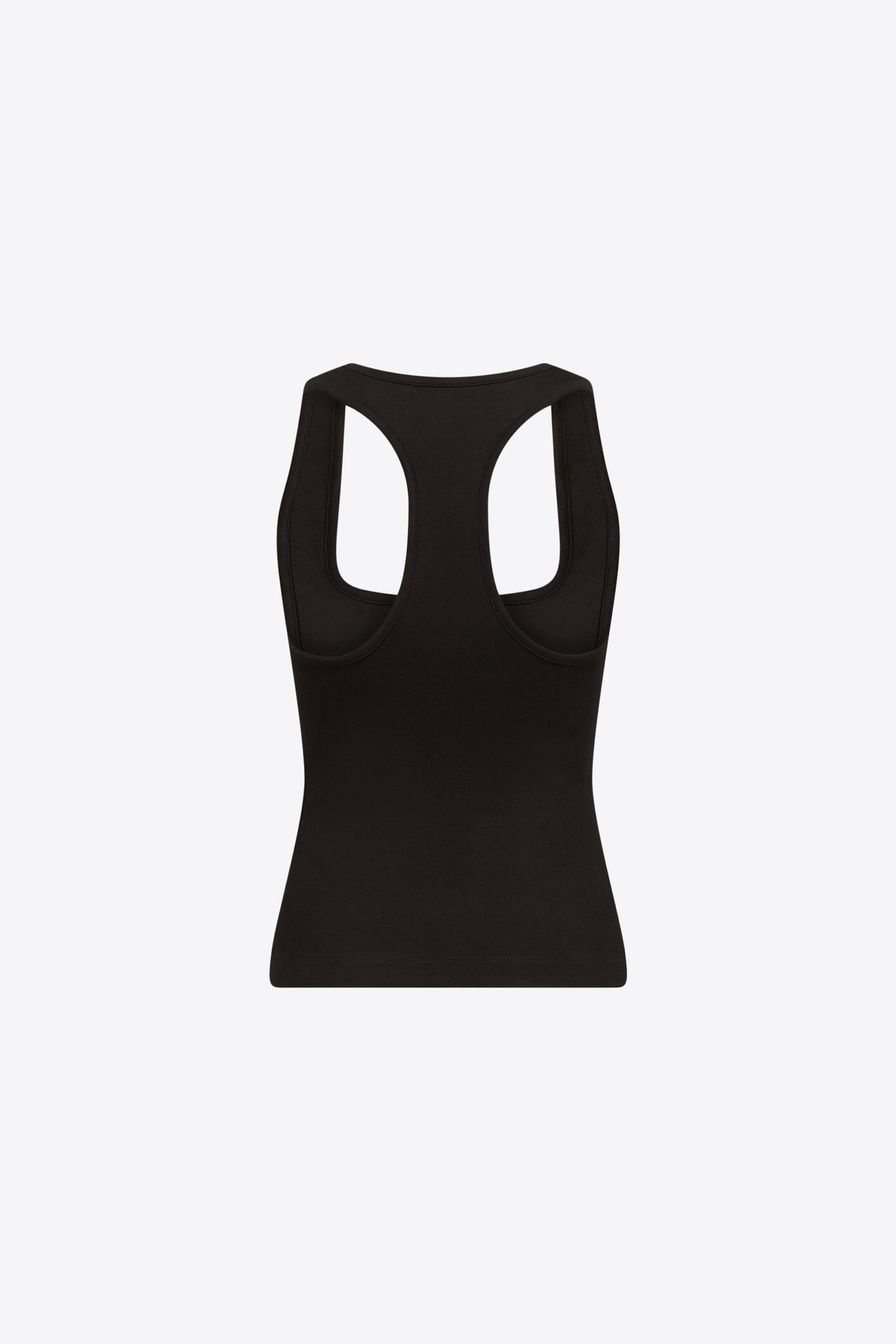 Compact ponte jersey racerback tank top featuring 'AREA' crystal nameplate. Available in Black .