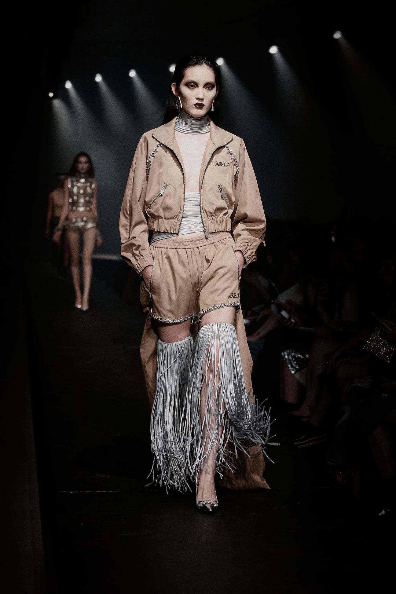 Nylon crystal trim track jacket with zip pockets. Features 'AREA' crystal nameplate at chest. Available in Camel.