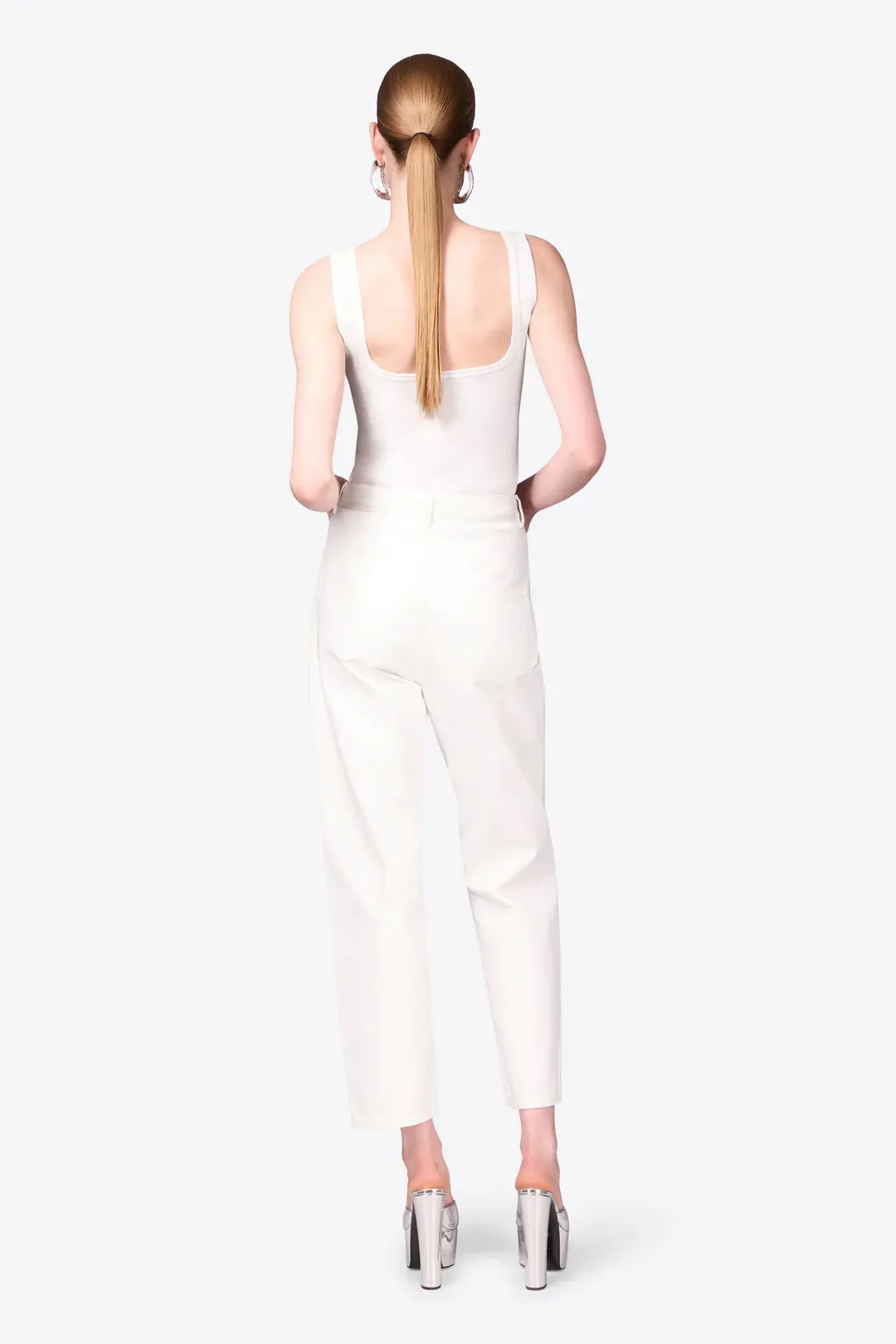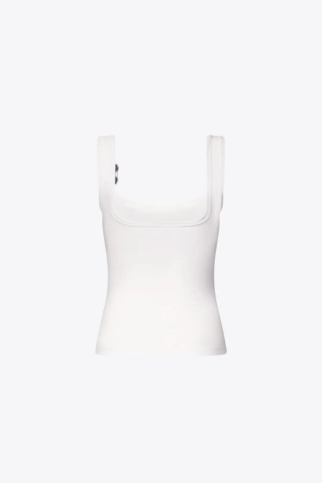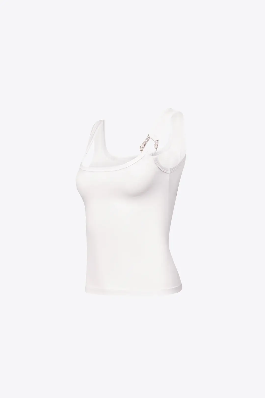 Square neck cotton blend tank top featuring pave crystal link embellishment on left shoulder strap. Available in Whipped White & Black.