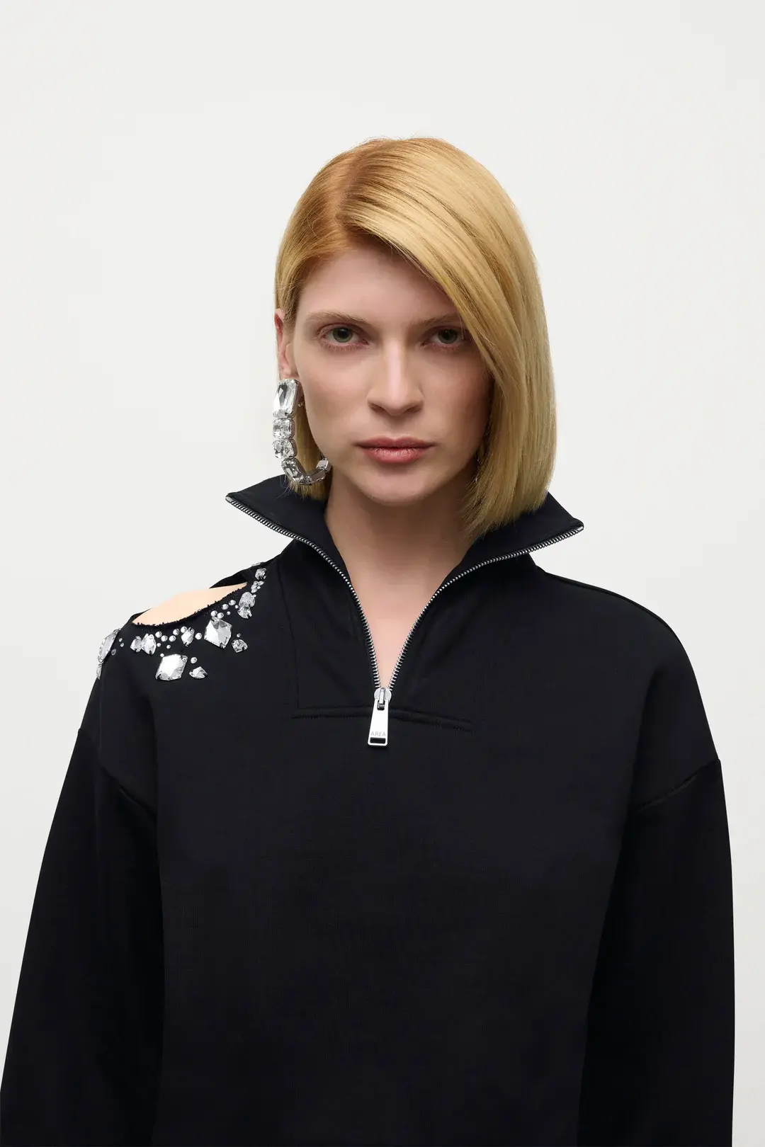 French terry quarter zip sweatshirt with crystal cluster cutout at shoulder. Available in Black. - Made in Italy - 100% Cotton - Dry Clean Only - Model is 5'9.5" and wears a size S