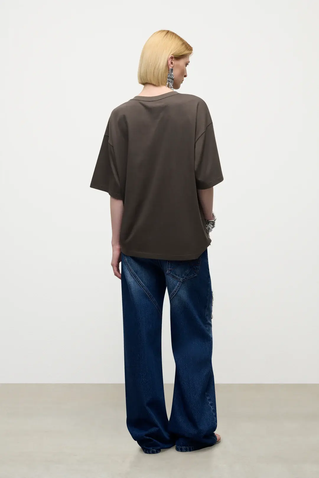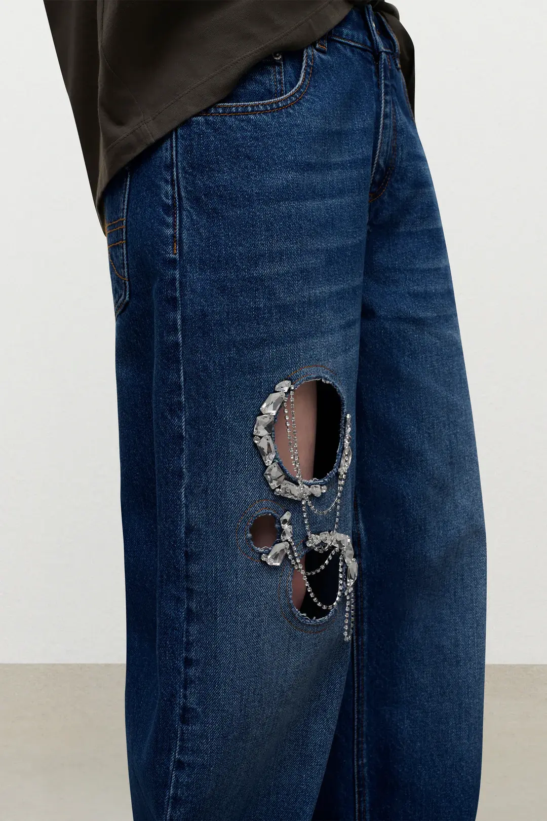 Relaxed fit denim jeans featuring crystal chain cutout embellishment at leg. Available in Medium Blue & Washed Black.