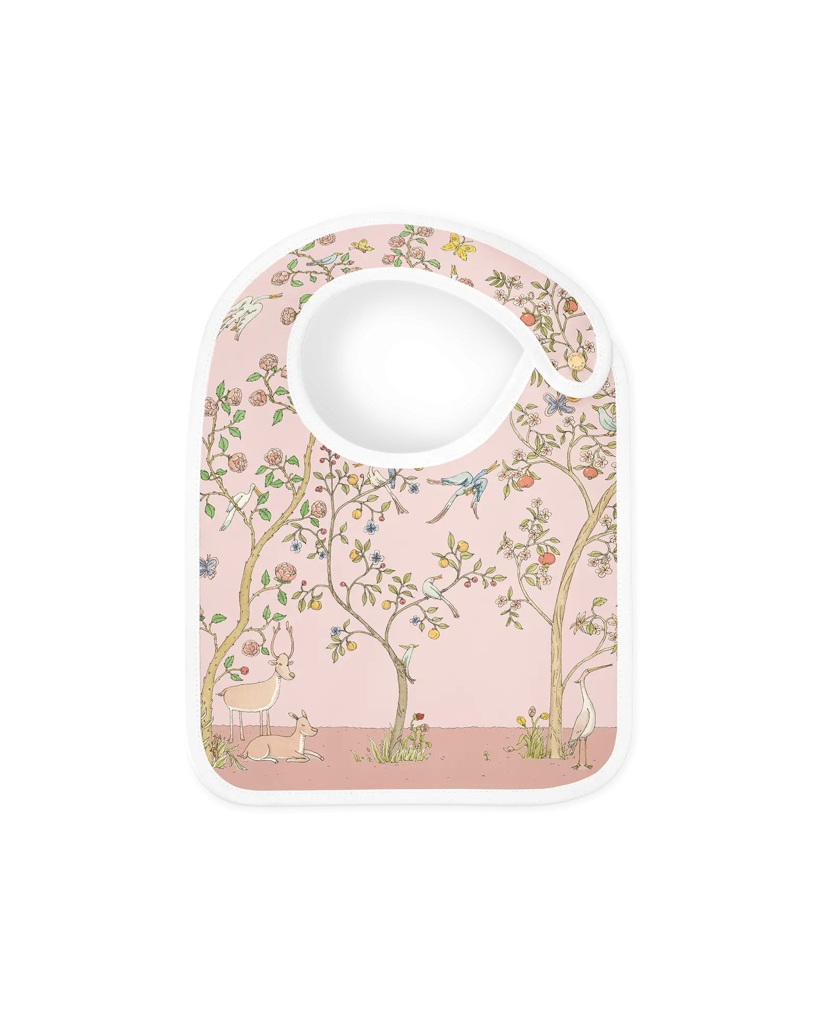 The Atelier Choux Carré & Bib Set – In Bloom Pink is a refined gift set featuring our iconic Carré and matching satin bib in a delicate floral and fauna print. With its tranquil garden scene of blooming trees, colorful birds, butterflies, and gentle woodland animals, this set offers a poetic blend of elegance and everyday practicality for newborns.