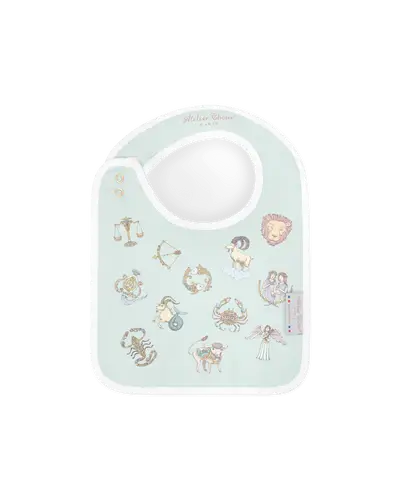 Reversible and adorned with original celestial-themed illustrations on both sides, the bib features adjustable golden snaps and is recommended from birth to 36 months.