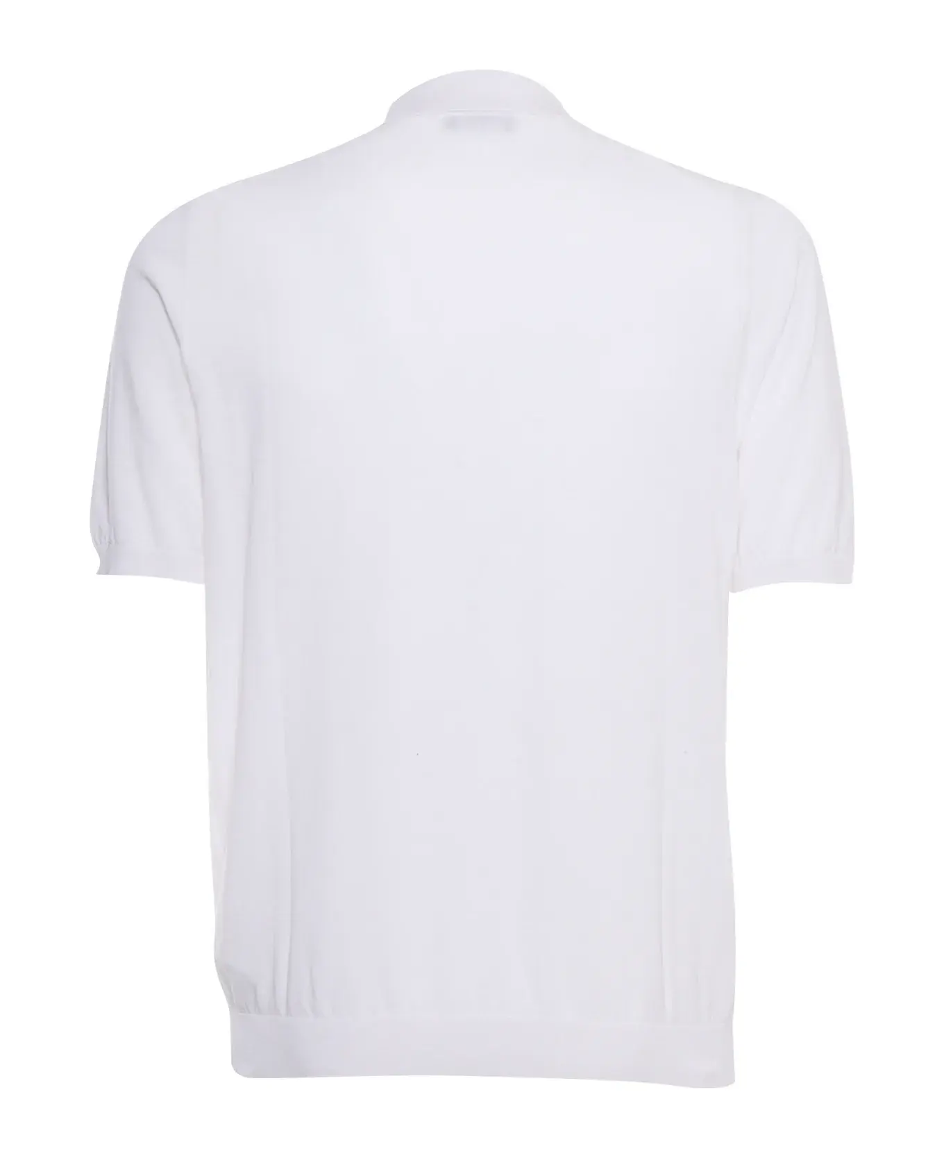 White mens cotton polo shirt with short sleeves, collar, front buttons, high hems.