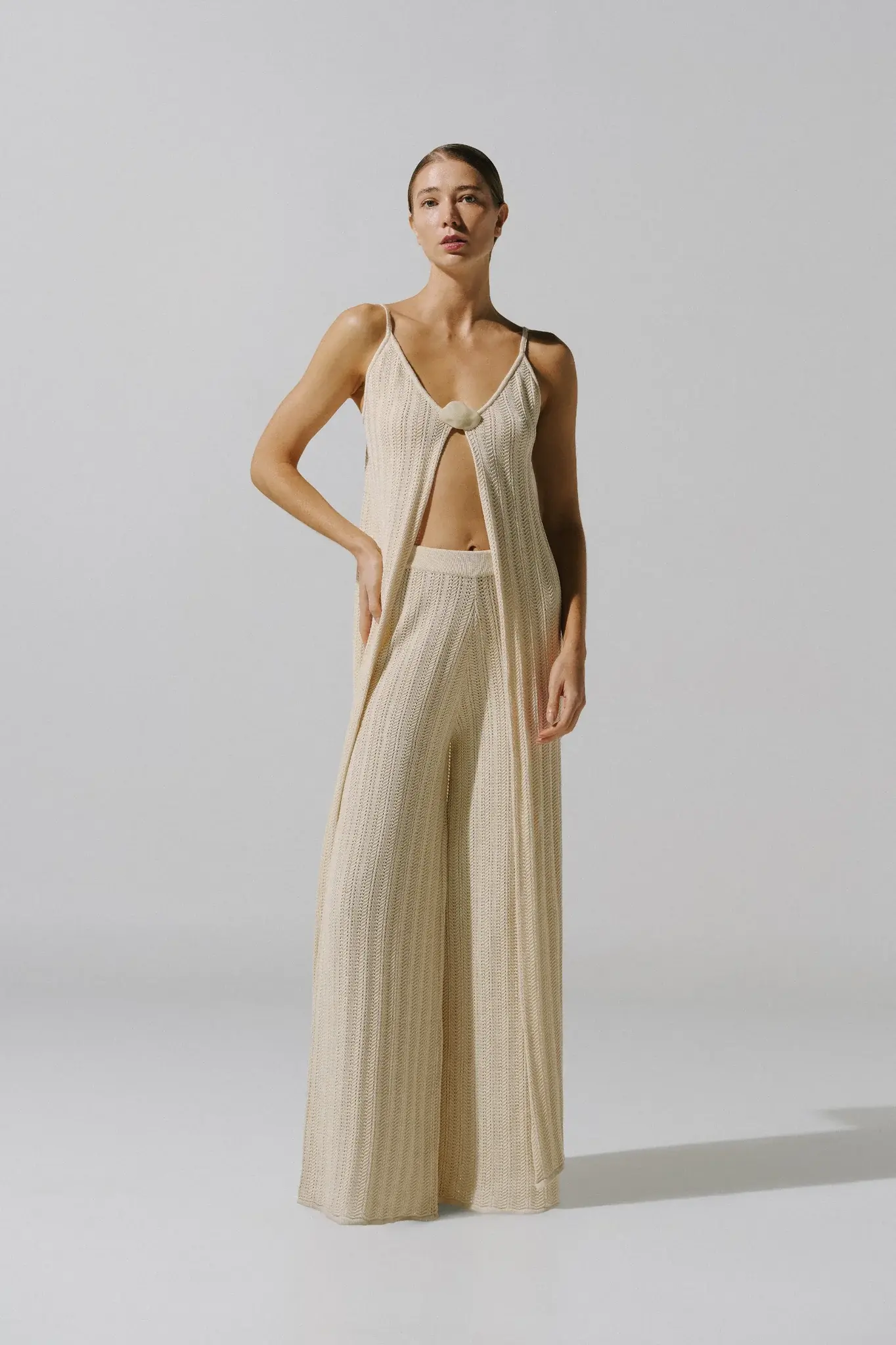 V-neckline Adjustable straps Baobab-shaped embellishment Front slit Knit fabric Unlined