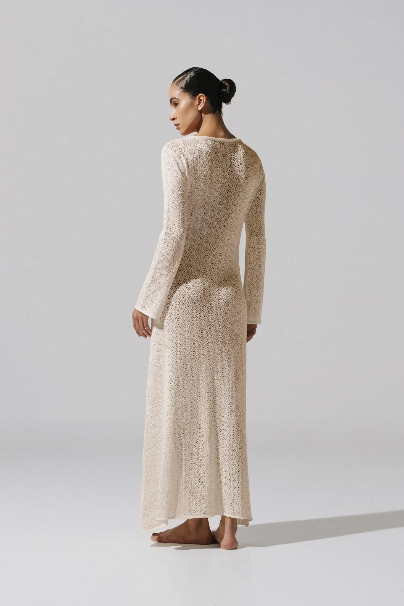 V-neckline Long sleeves Ring detail Knit fabric Sheer Unlined Maxi length