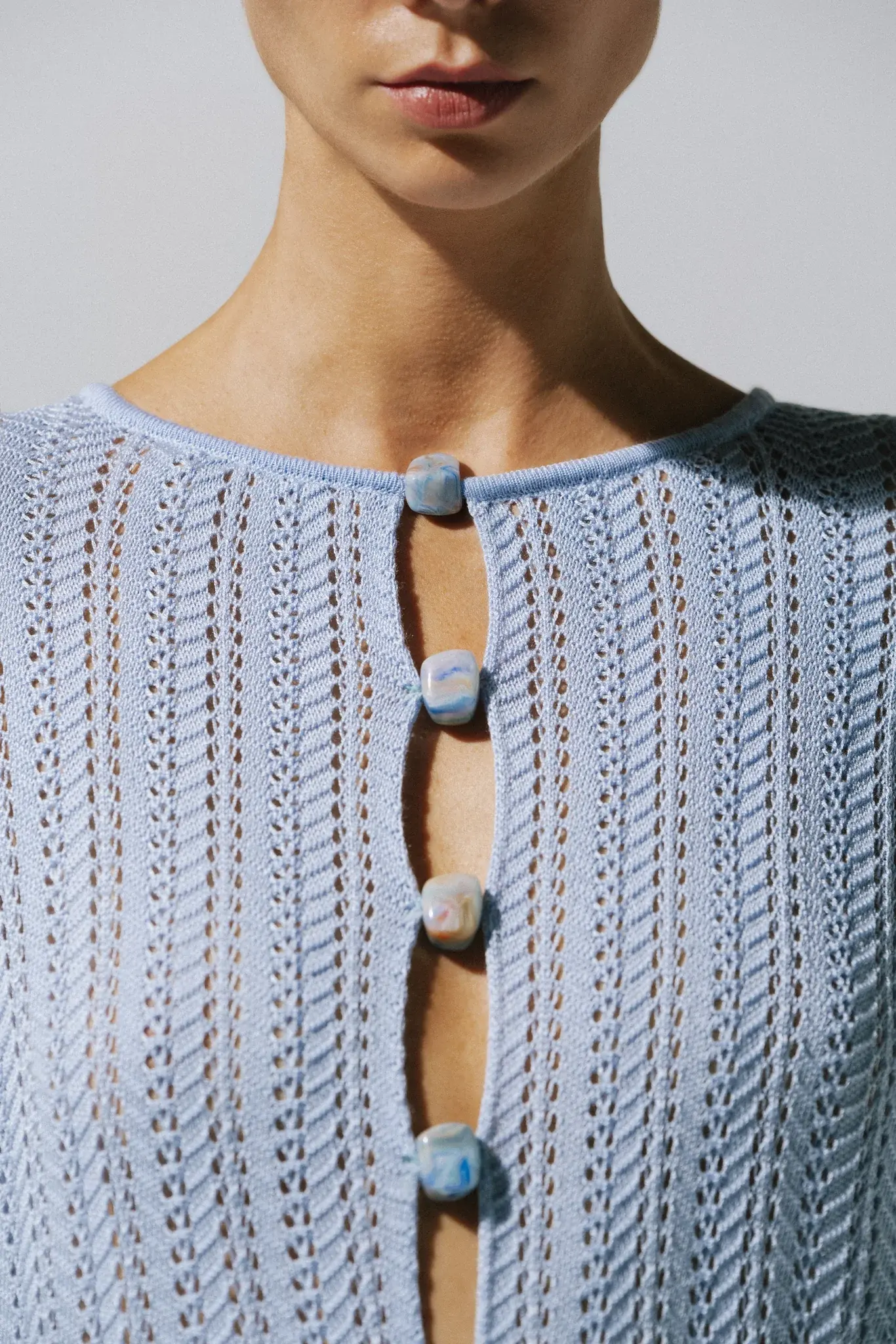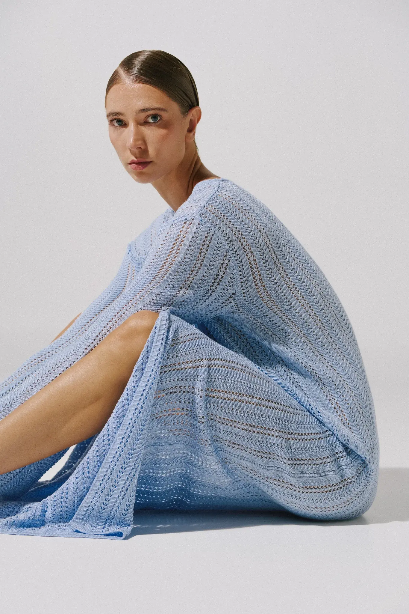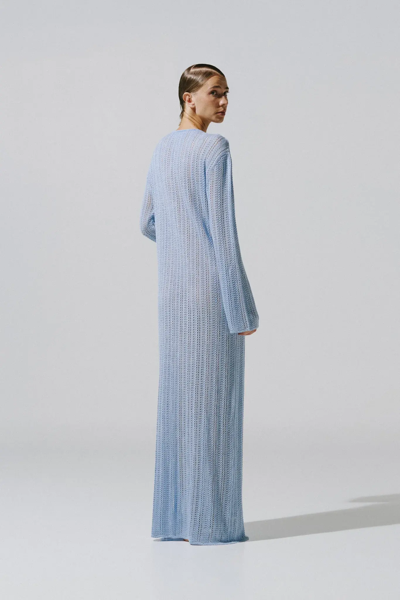 Round neckline Long sleeves Embellished with resin stones Front slit Knit fabric Unlined Maxi length