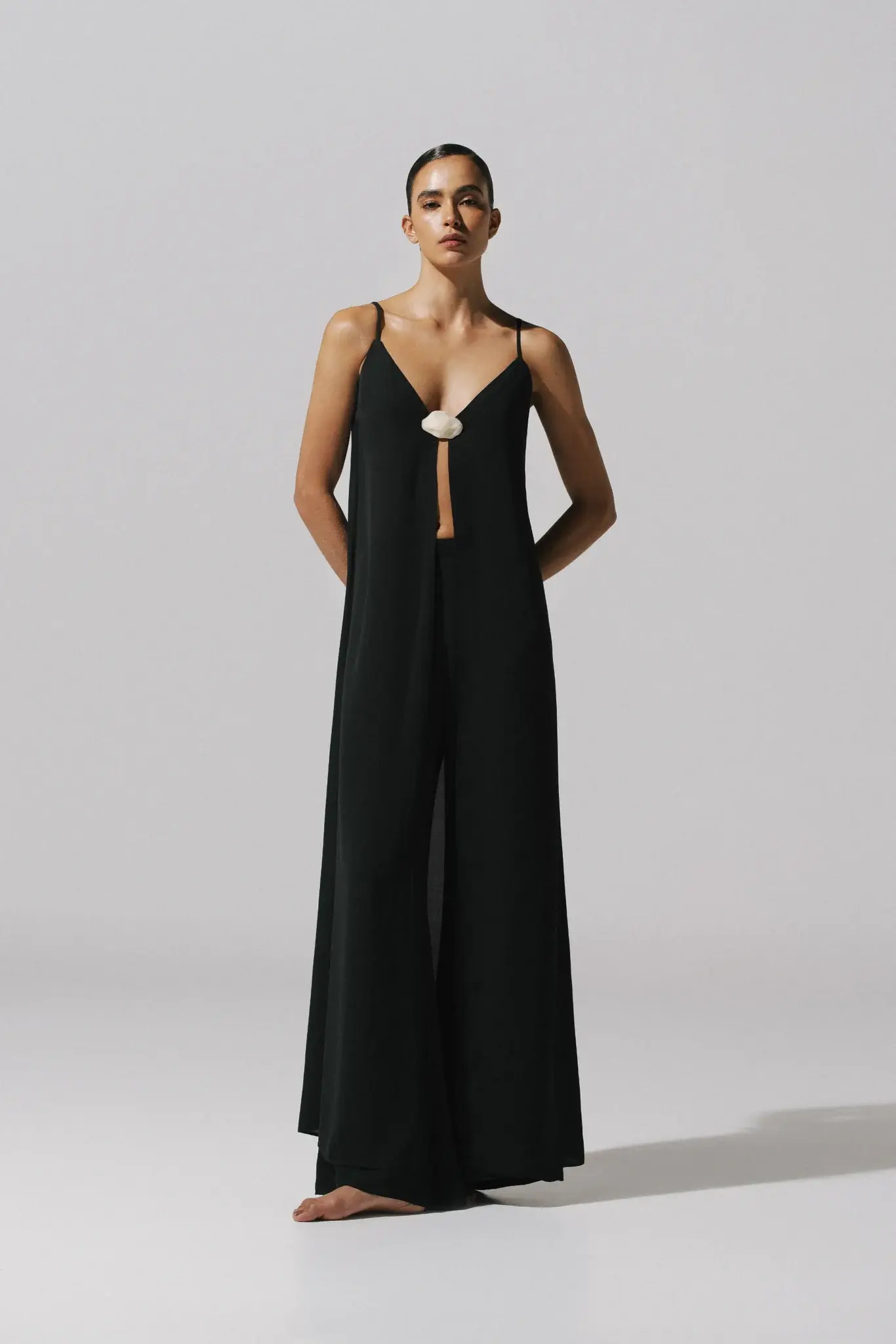 V-neckline Open back Adjustable straps Baobab-shaped embellishment Front opening Parcially lined Maxi length