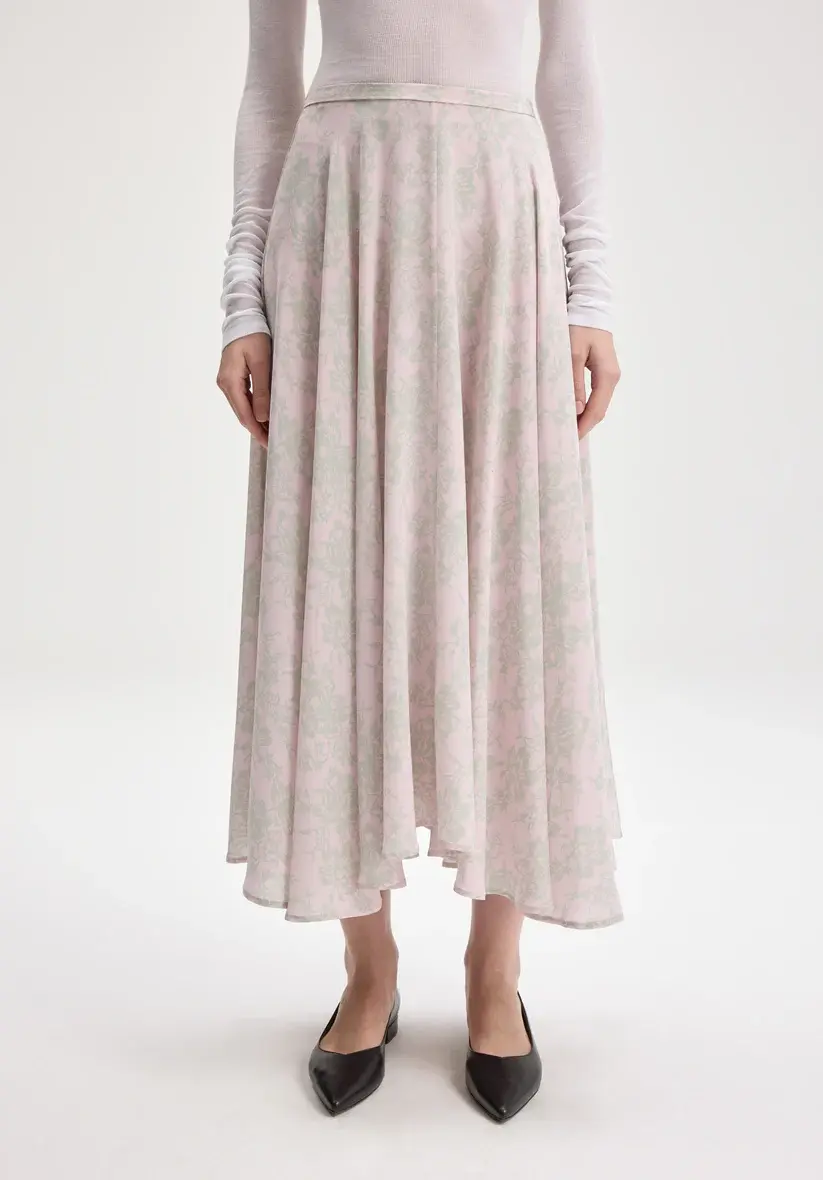 Calf-length skirt in fluid organic silk crepe from Como, Italy, with a sweeping A-line silhouette, adorned by the PS26 signature rose lace motif. Finished with a concealed zip closure and hook-and-eye fastening at the back.