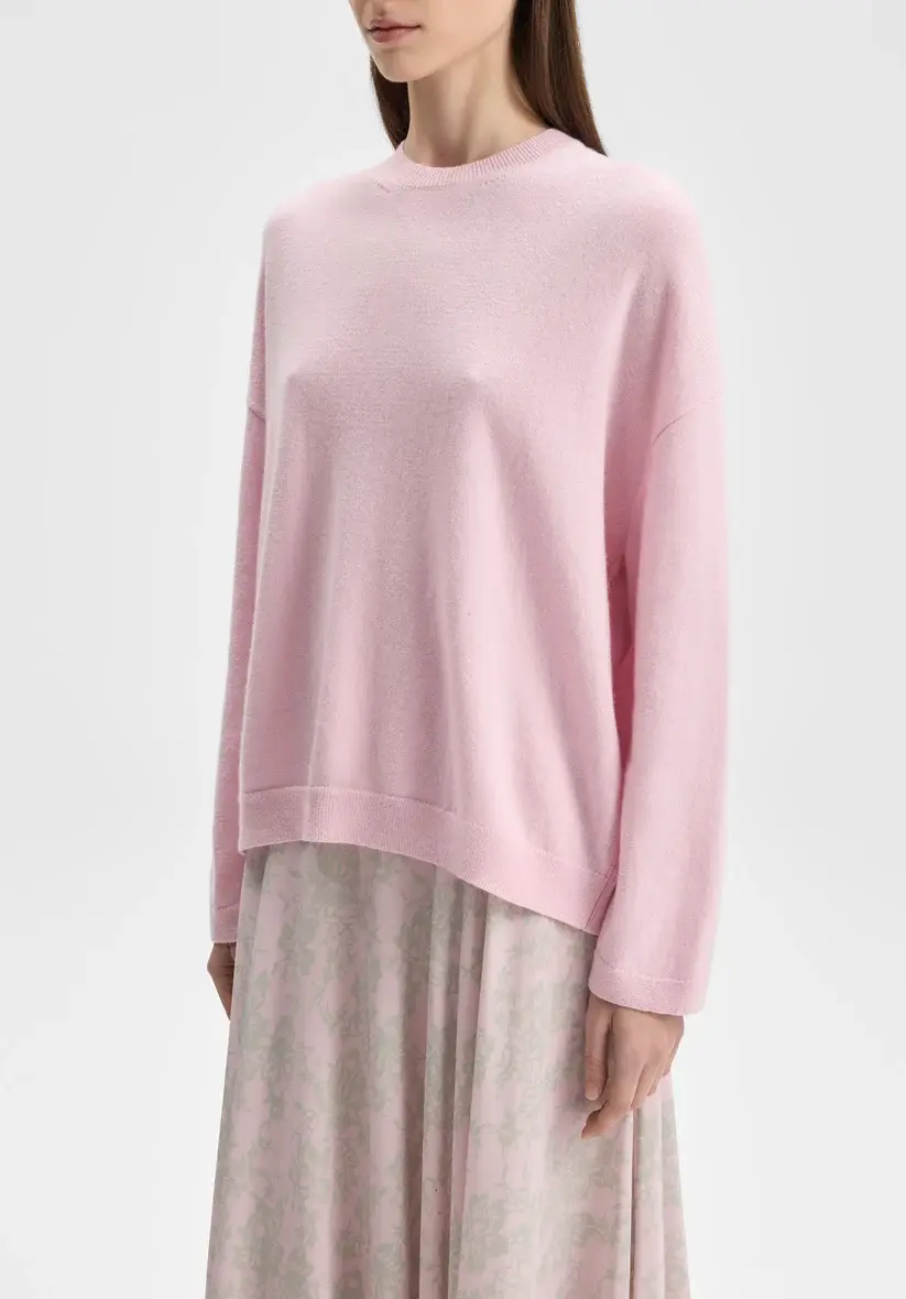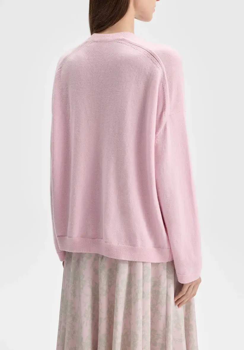 Classic crewneck sweater in finely knit Italian wool with a muted rose tone, easy, lightweight feel, relaxed fit, and fully fashioned detailing.