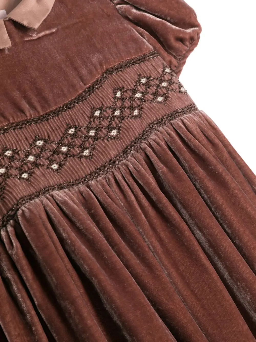 Highlights dark pink crushed velvet embroidered design pleat detailing Peter Pan collar rear button fastening short sleeves flared straight hem