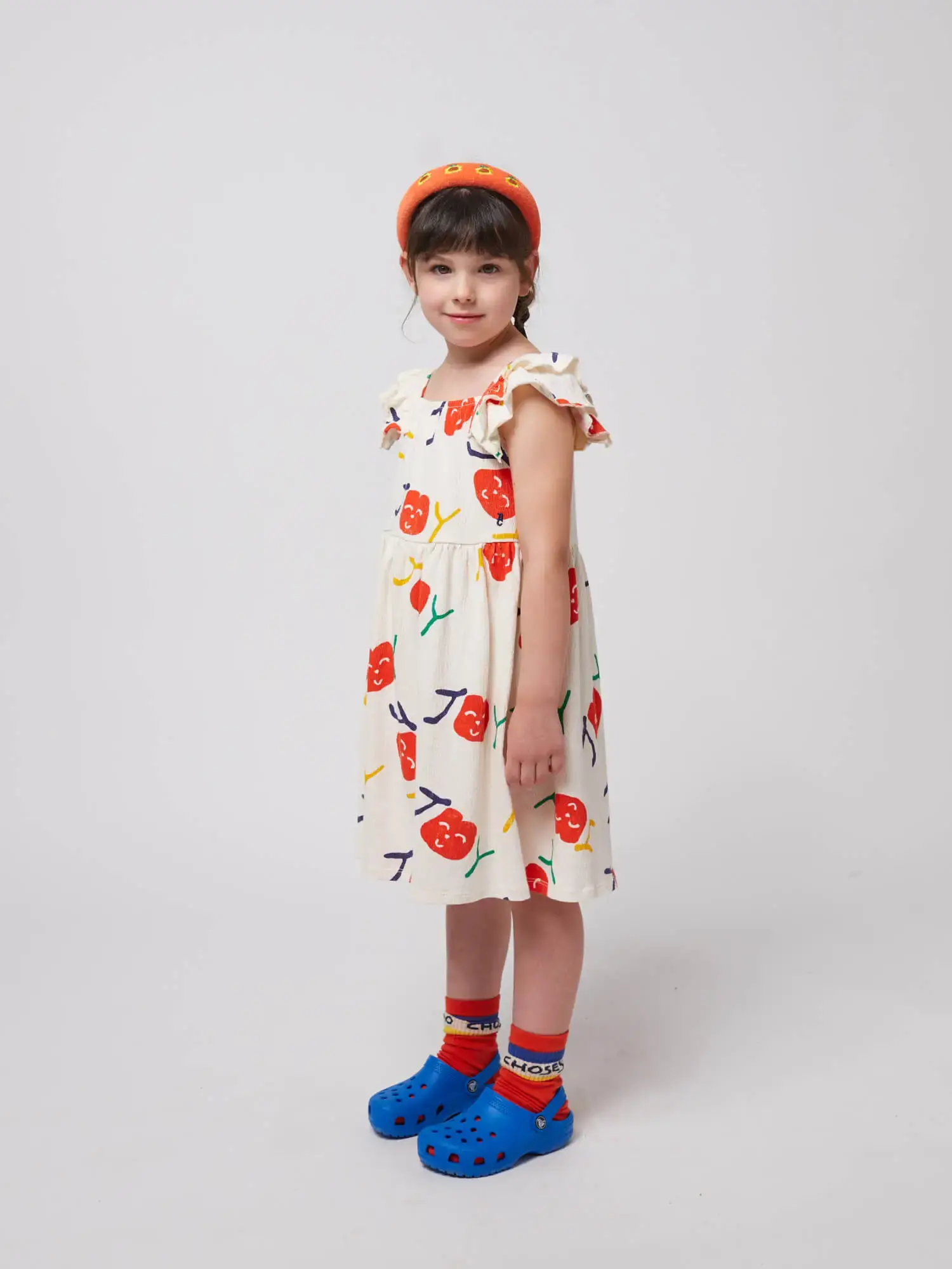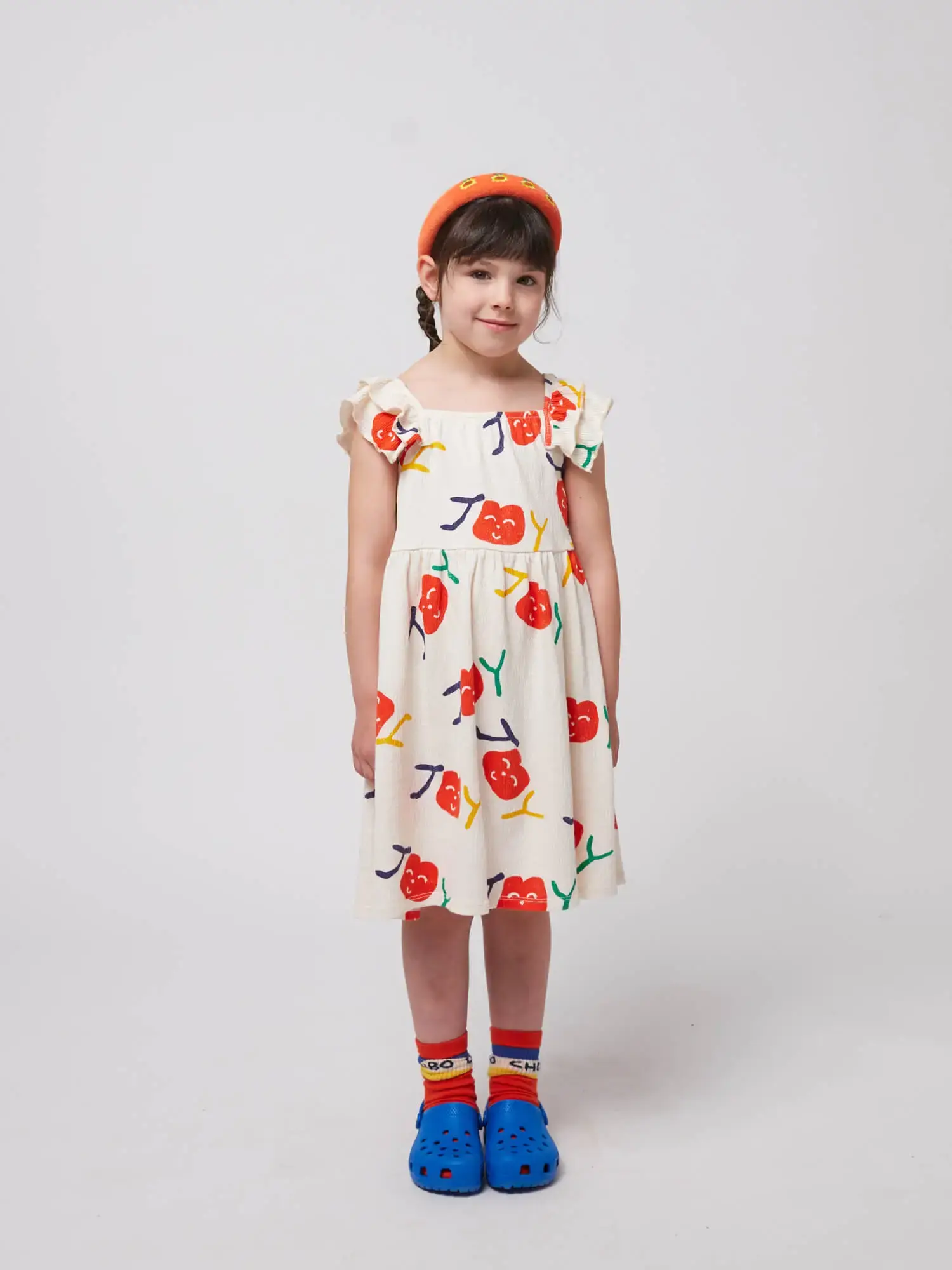 Feminine and breezy, this offwhite dress combines 2% polyester, 2% elastane, and 96% organic cotton. Featuring sleeveless straps, gathering details, embroidery, an evasé fit, short length, and ruffled detailing, it’s ideal for sunny days. Made in Spain.