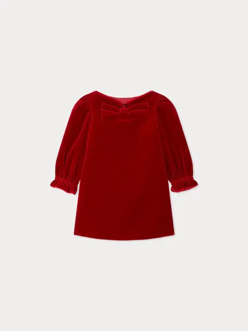 The Jove dress captivates girls with the rich hue of its ultra-soft, smooth velvet. A large bow and a jeweled button adorn the teardrop opening at the upper back. The straight neckline and elasticated cuffs feature an elegant scalloped finish. This dress, made from organic cotton, has a slightly flared silhouette.