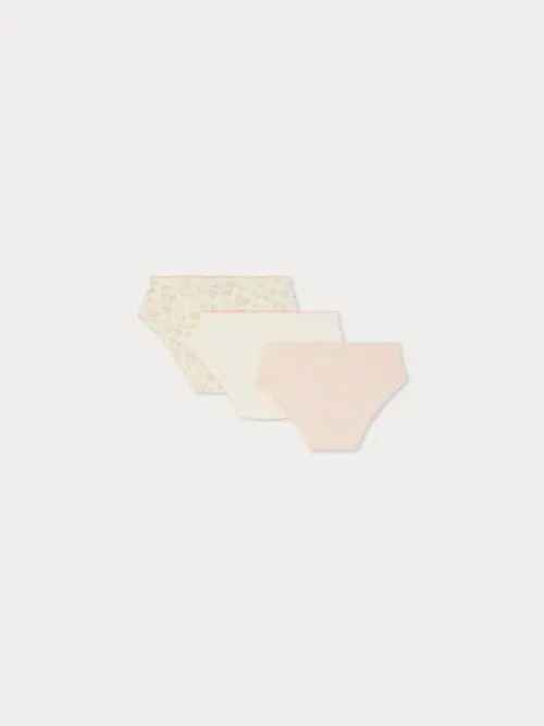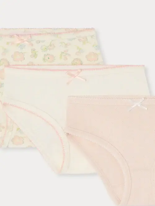This set of Aubree girls' panties features contrasting picot trims and a bow at the waist. Two are solid color, one is printed.