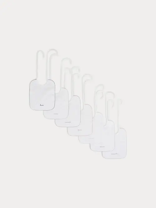 This adorable weekly baby bib set comes with a plushy in the shape of a bunny, and a matching hat. Each bib is adorned with a day of the week in colorful embroidery.