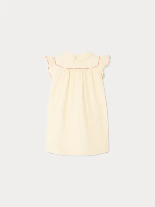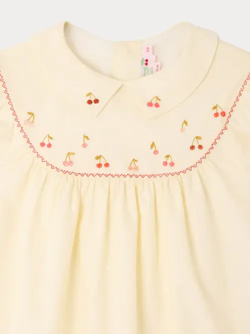 The Lacey-Ann girls' dress is adorned with hand-embroidered cherry motifs at the collar and yoke, showcasing Bonpoint's craftsmanship. The short, ruffled sleeves are also finished with a color-coordinated trim. Buttons at the upper back add a practical touch, while the cotton voile lining ensures optimal comfort for everyday wear.