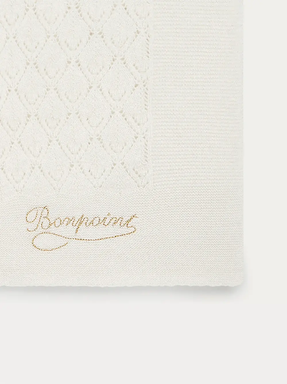 This warm blanket will be a haven of softness for your baby. Its fine knit is embellished with a delightful openwork diamond pattern.