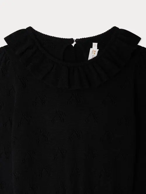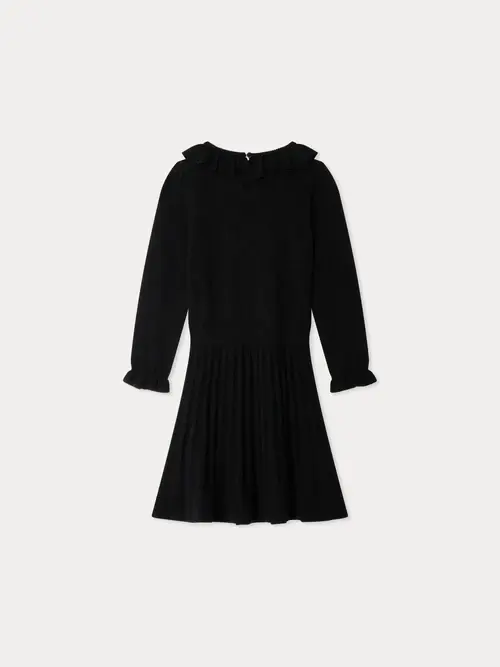 Simple and elegant, the Jelma dress for girls is perfect for creating a sophisticated outfit for a special occasion. Its charm comes from its ruffled round neck, its knitted top decorated with openwork cherries, and its godet skirt. Made from a blend of wool, silk, and cashmere, this model is charming for its warmth and softness.