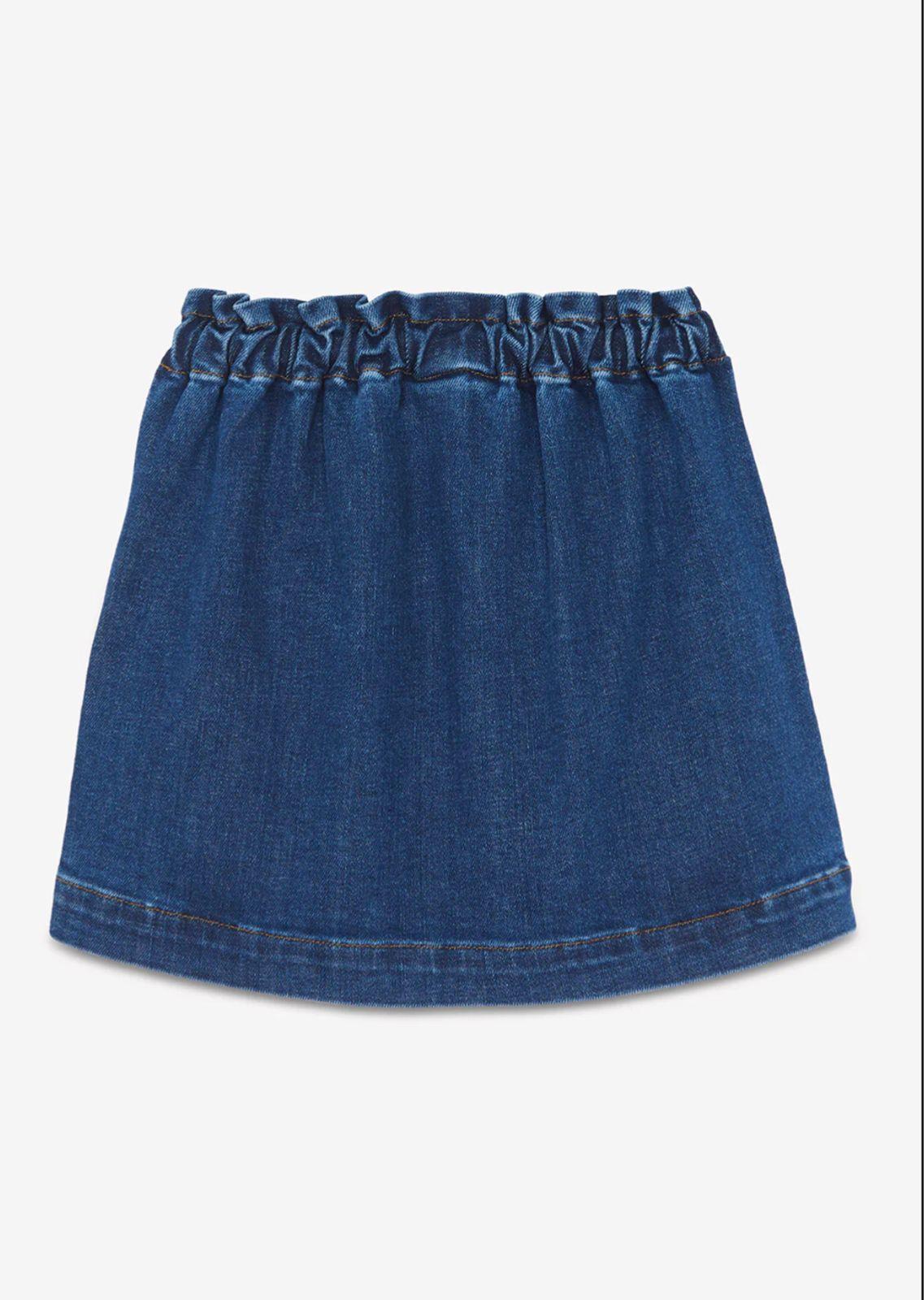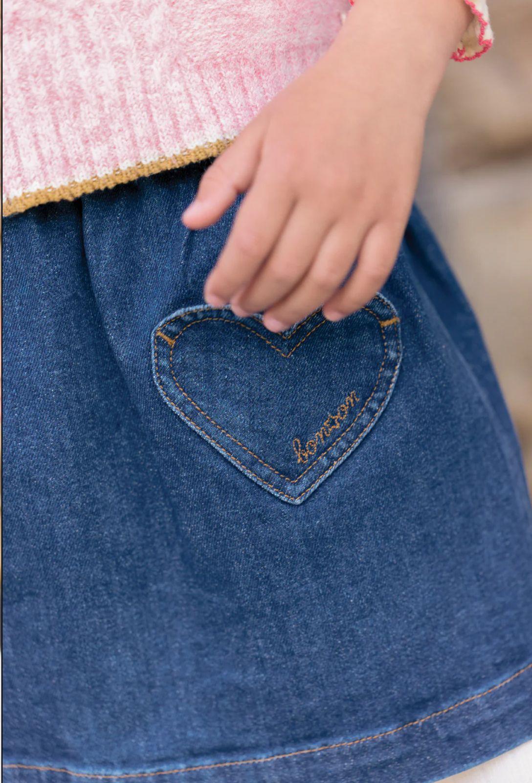 Discover the Skirt Douchka in raw denim, a wink to the wild west of the "New Barn" collection! With its elastic waist and heart -shaped panels, it is perfect for stylish adventures. Its trapeze cut ensures optimal comfort to turn all day. To associate with a colorful t-shirt and ankle boots for a modern and fun cowgirl look!
