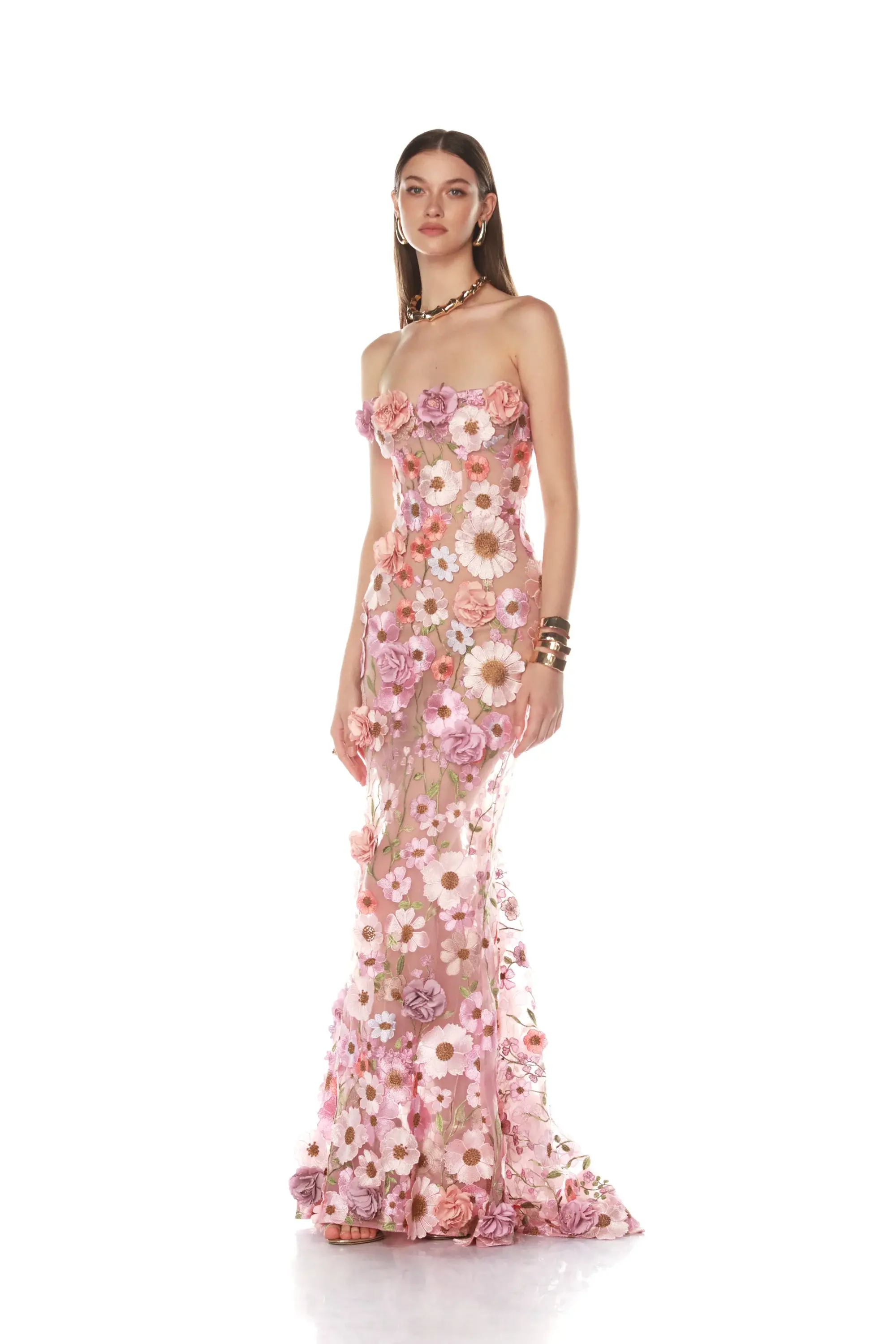 Experience timeless elegance with our Jasmine Pastel Pink Gown, featuring a sweetheart neckline adorned with delicate floral appliqués and a dreamy pastel pink hue.
