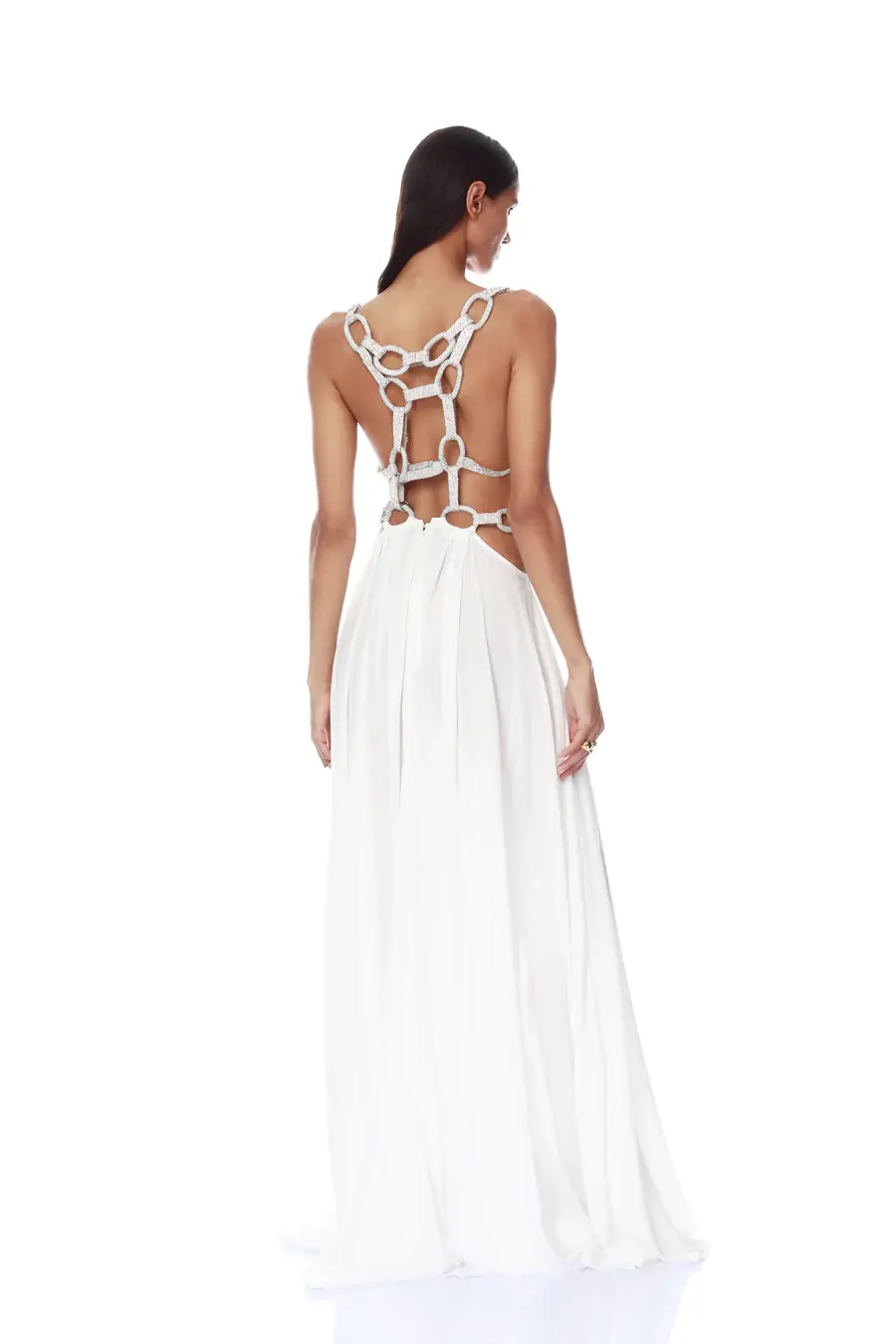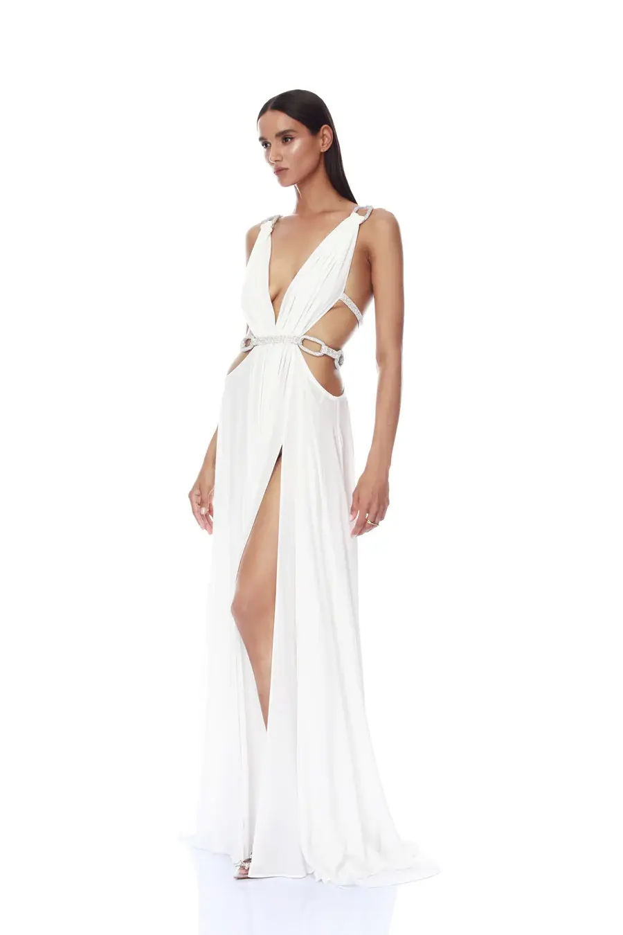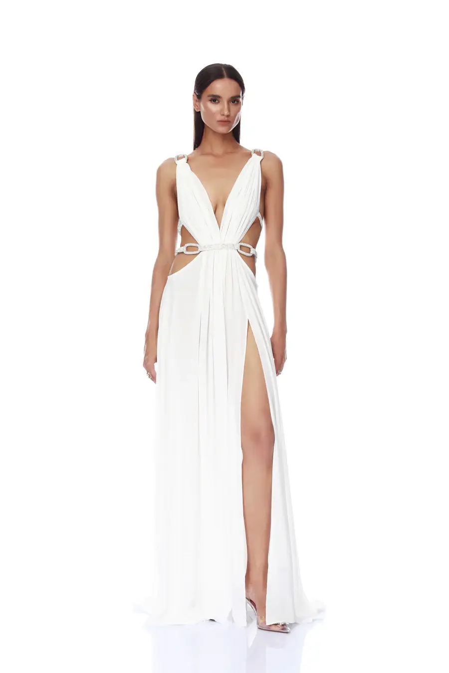 Deep-v neckline High-cut leg slit Crystal embellished chain link