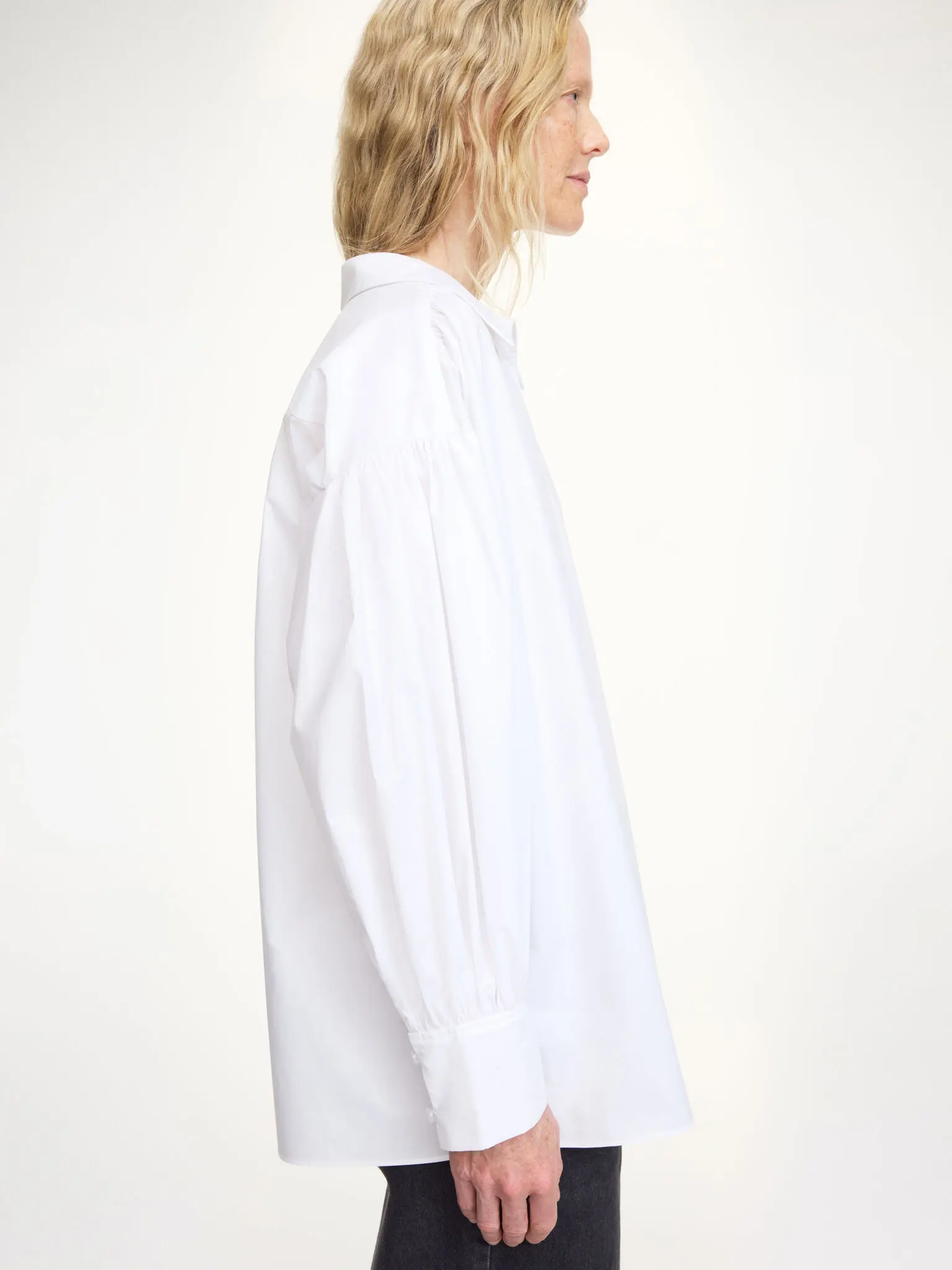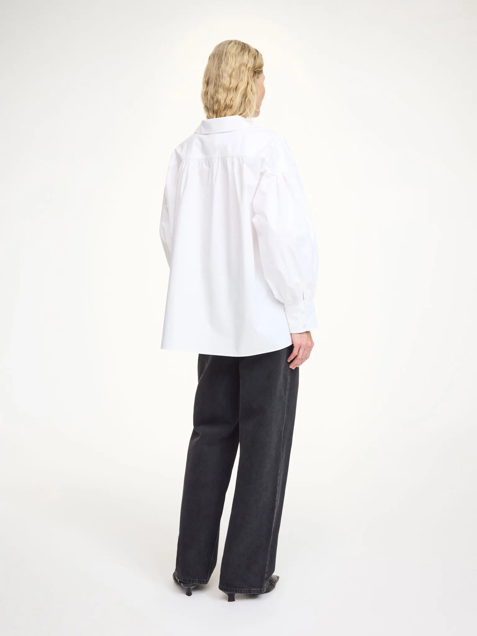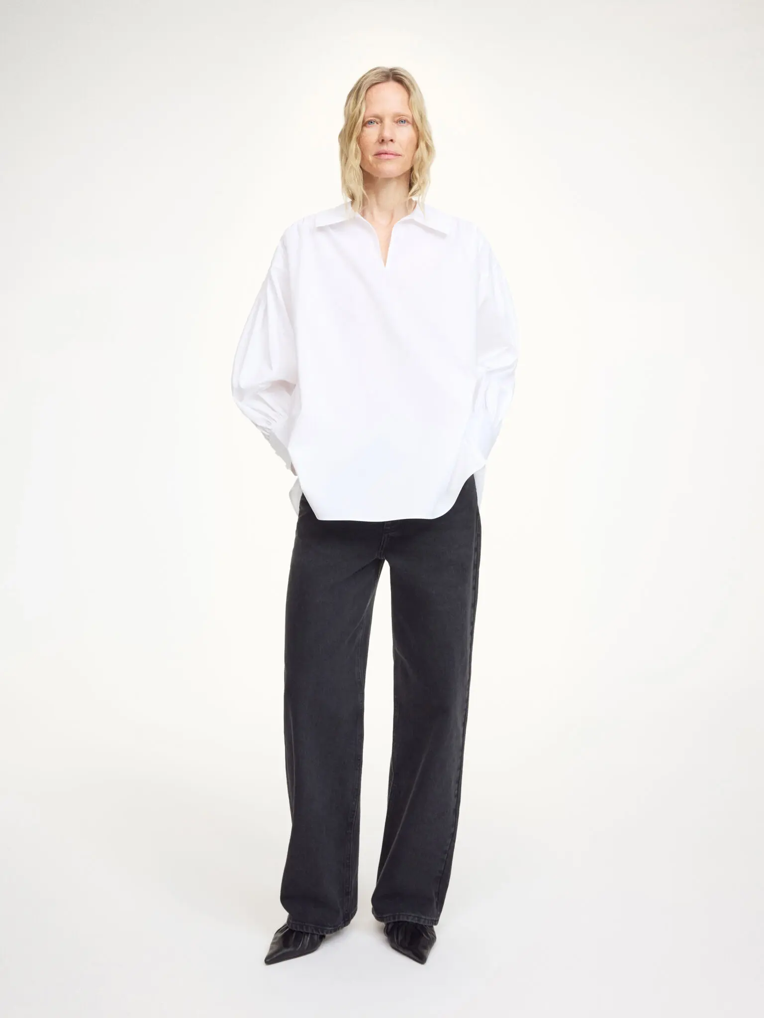 Designed in a minimalist silhouette that will transcend seasons, the Leonora blouse will slot right into your existing wardrobe. Made in crisp organic cotton, the tunic-style design has a sharp collar, V-neck and buttoned cuffs. Notice the small, embroidered monogram.