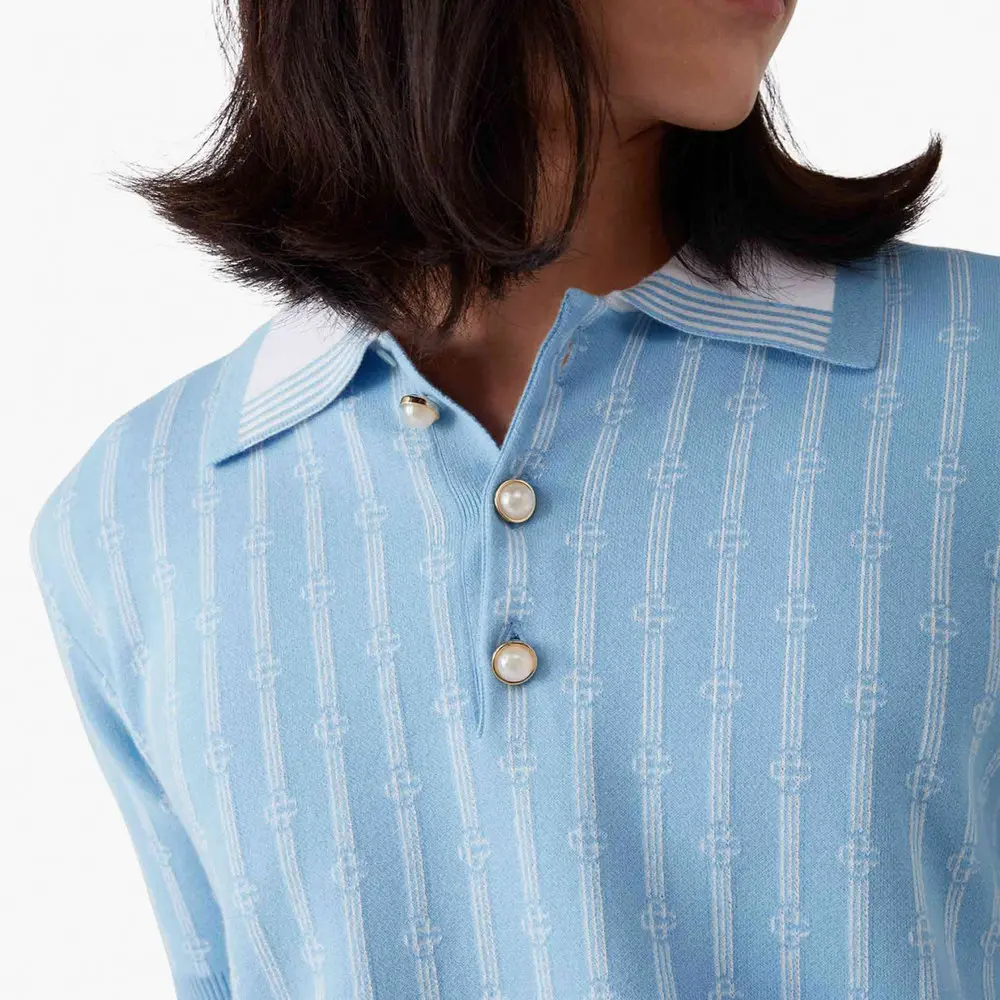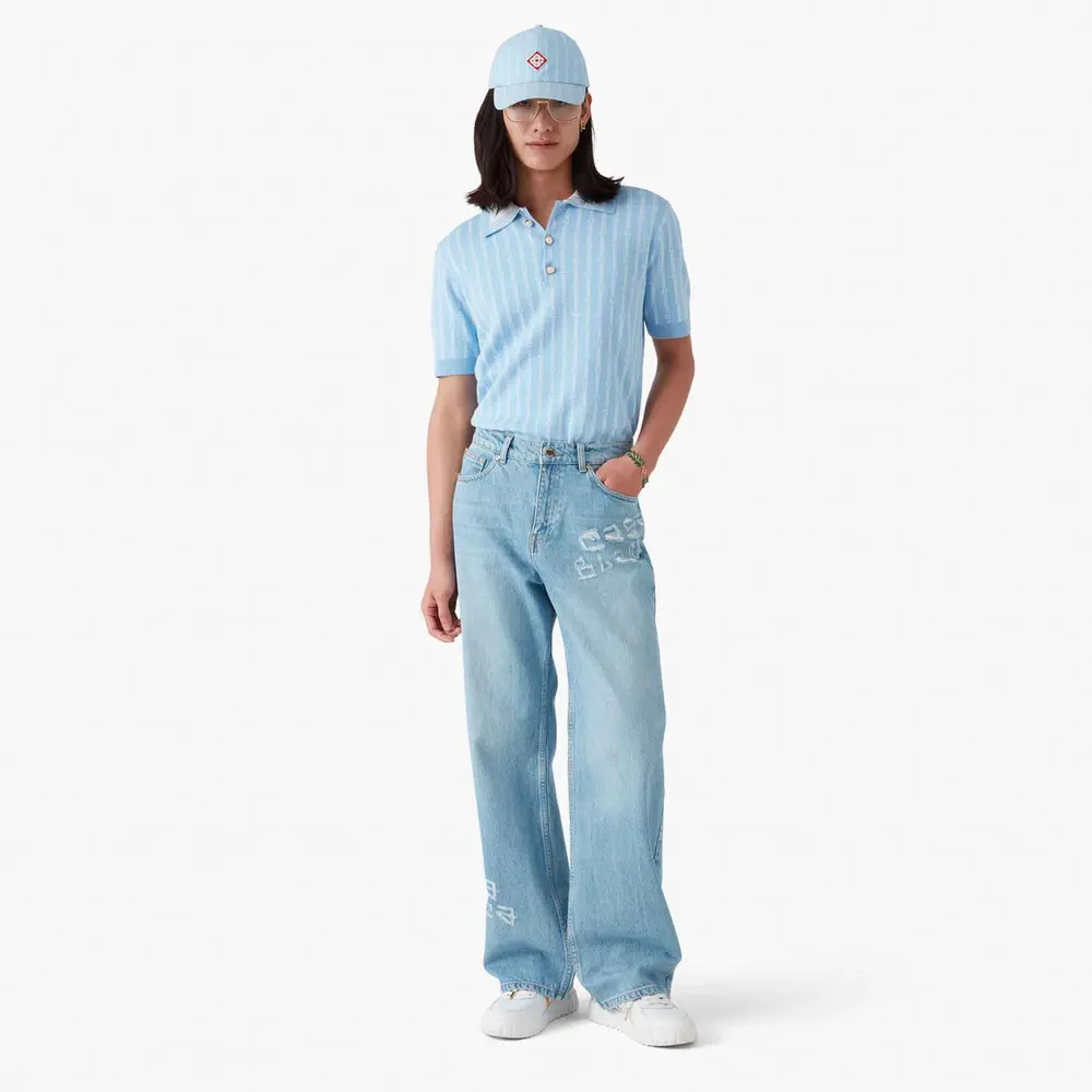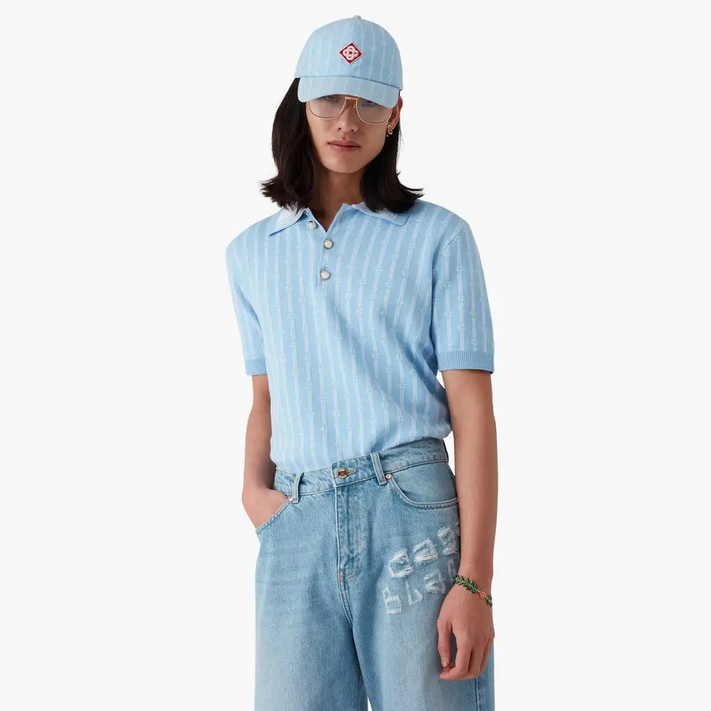 The Casablanca Monogram Polo Shirt is a short-sleeve design crafted from cotton blend fabric featuring a classic three-button placket. Completed with the house's signature gold rim pearl buttons, rib cuffs, hem, and collar with edge detail.