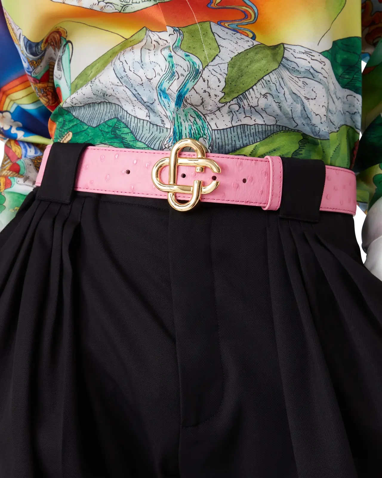 The men's pink embossed CC logo belt features the house's signature interlocking CC buckle with an Italian goat leather strap. Completed with ostrich effect printed quill bumps.