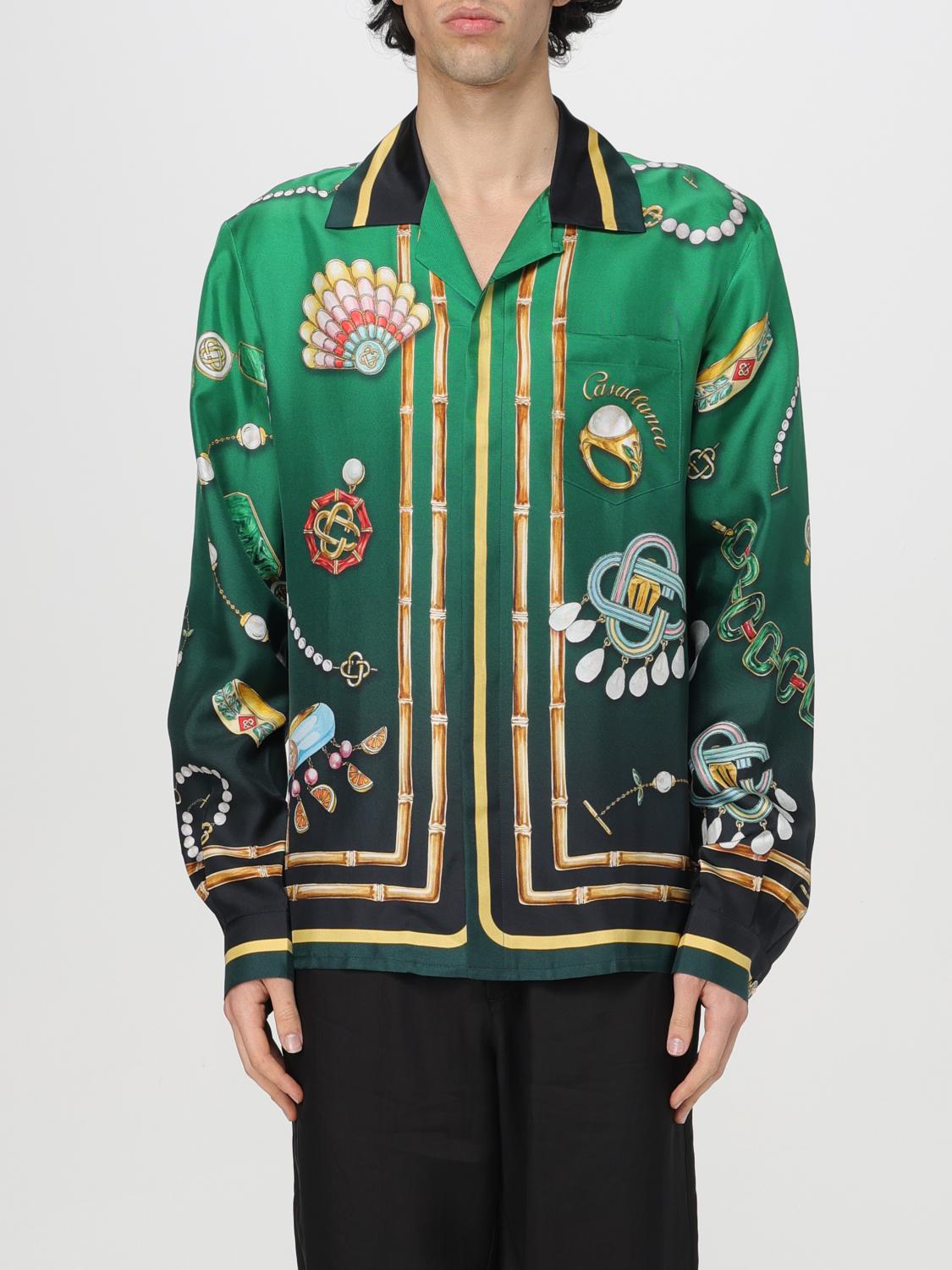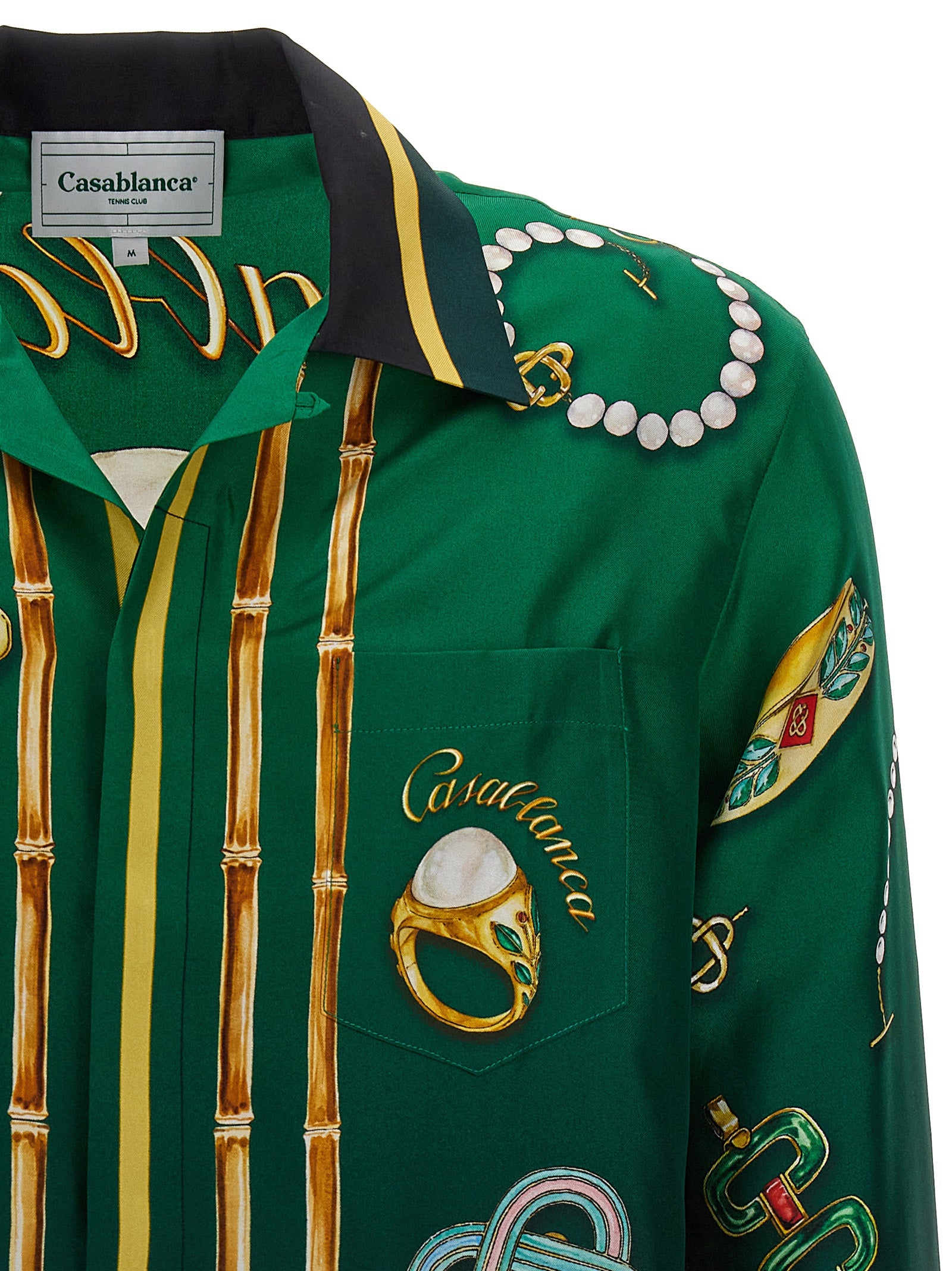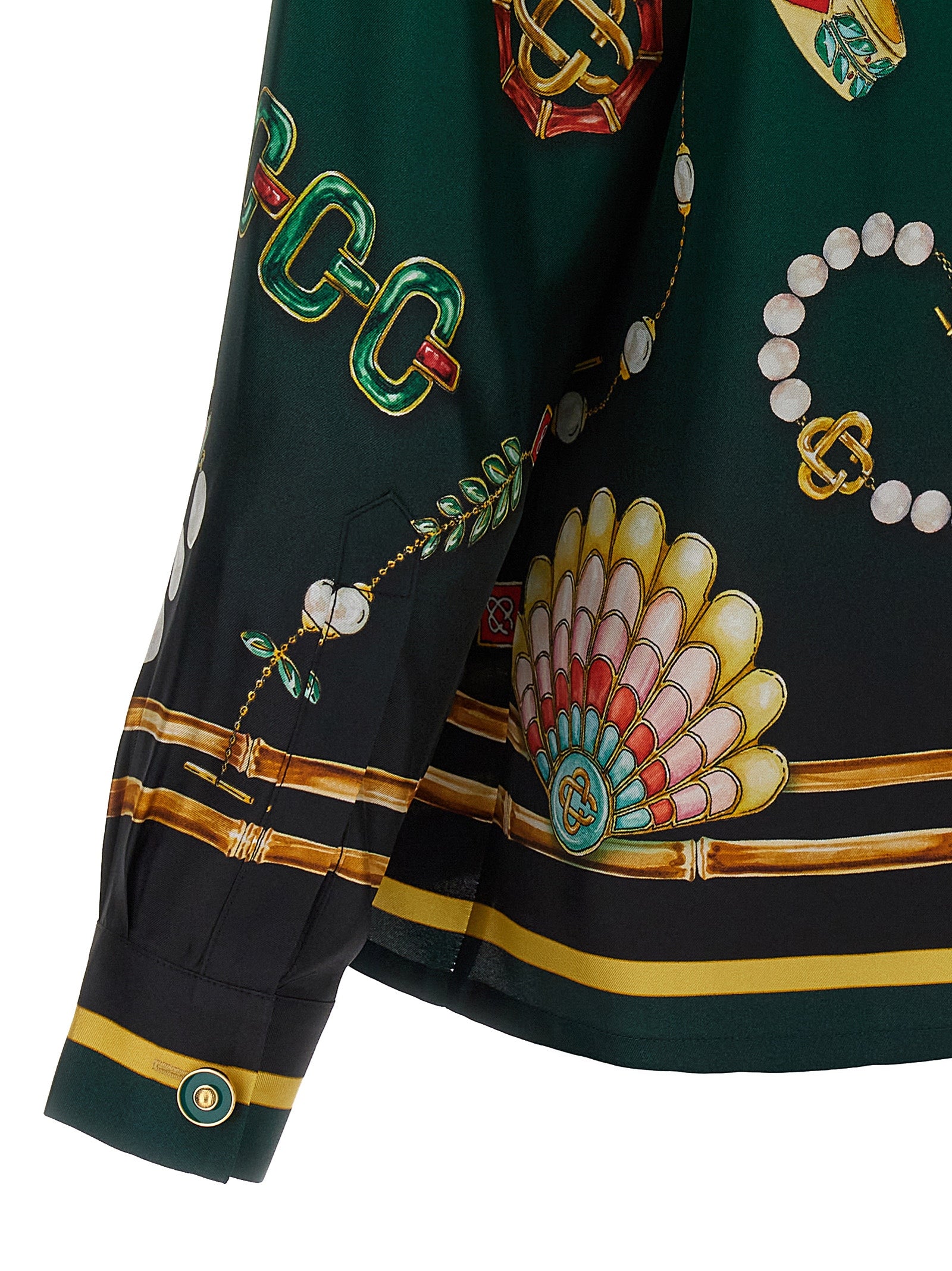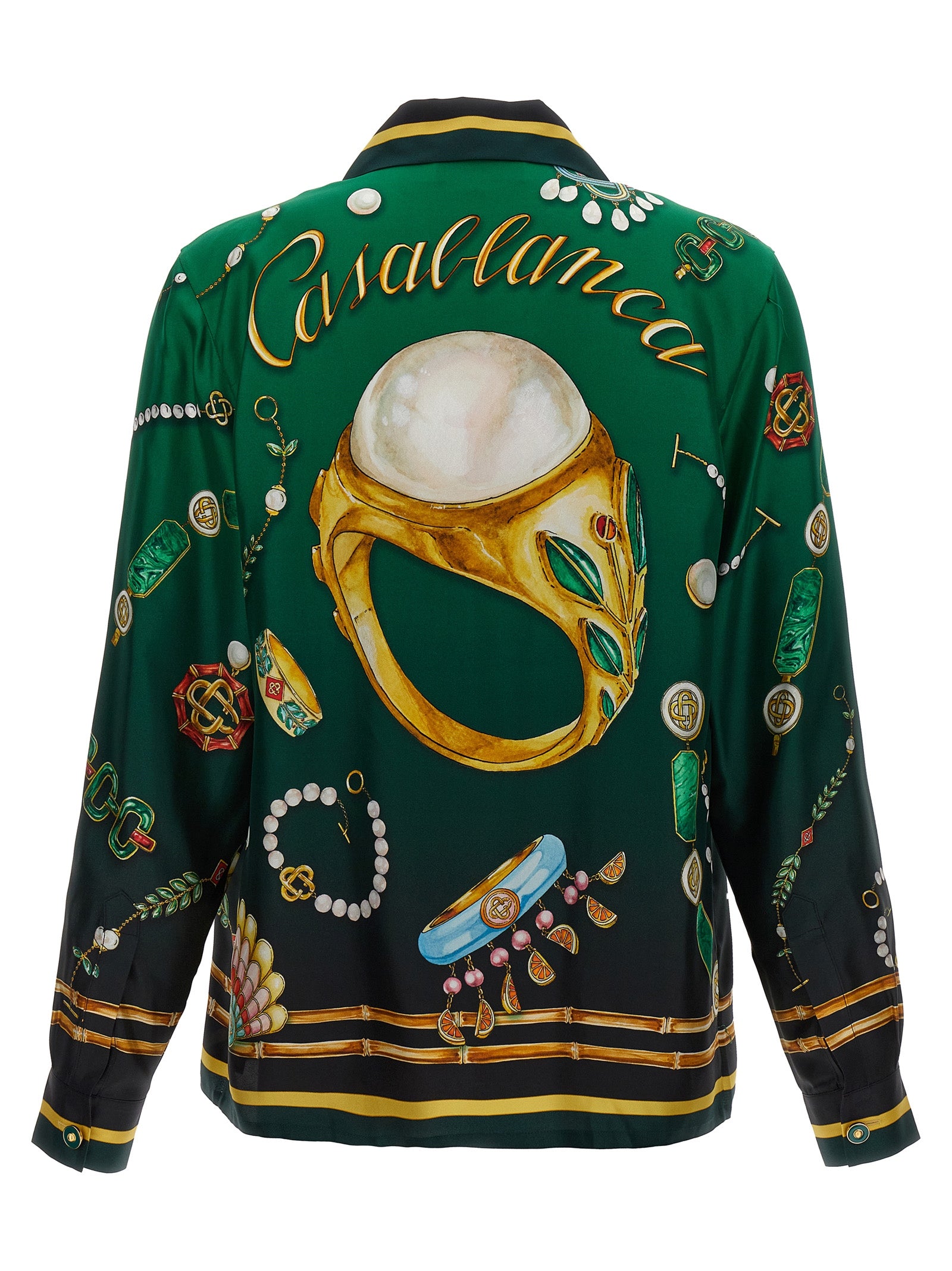 The La Boite A Bijoux silk shirt is an all-over printed design featuring some of the house's previously designed jewellery and floral details reinterpreted for this season. Completed with the house's signature gold rim pearl buttons, Casablanca branded label and detail on the collar, cuffs and hem. Printed silk twill fabric 100% silk La Boite A Bijoux print Specialised dry clean only Made in Italy Fits true to size, take your regular size The model is 187cm/6’1 and is wearing a size M