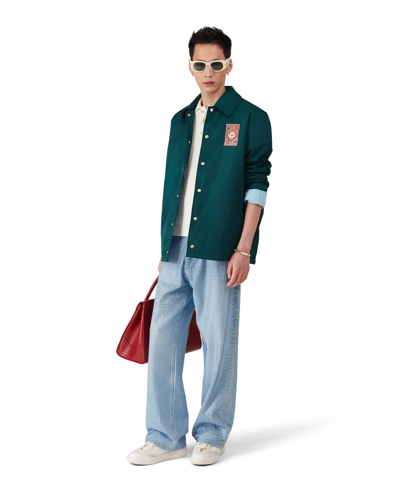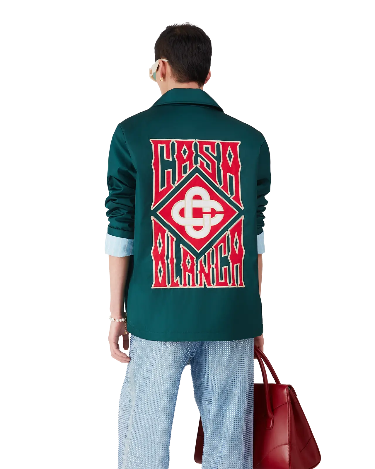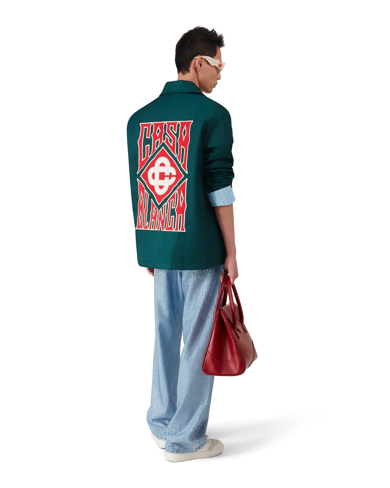 The Gothic logo stadium jacket is a long-sleeve light-weight design crafted from technical fabric featuring the house's gothic stacked logo. Completed with gold-plated snap button closure, a point collar, a lining, and slanted welt front pockets.