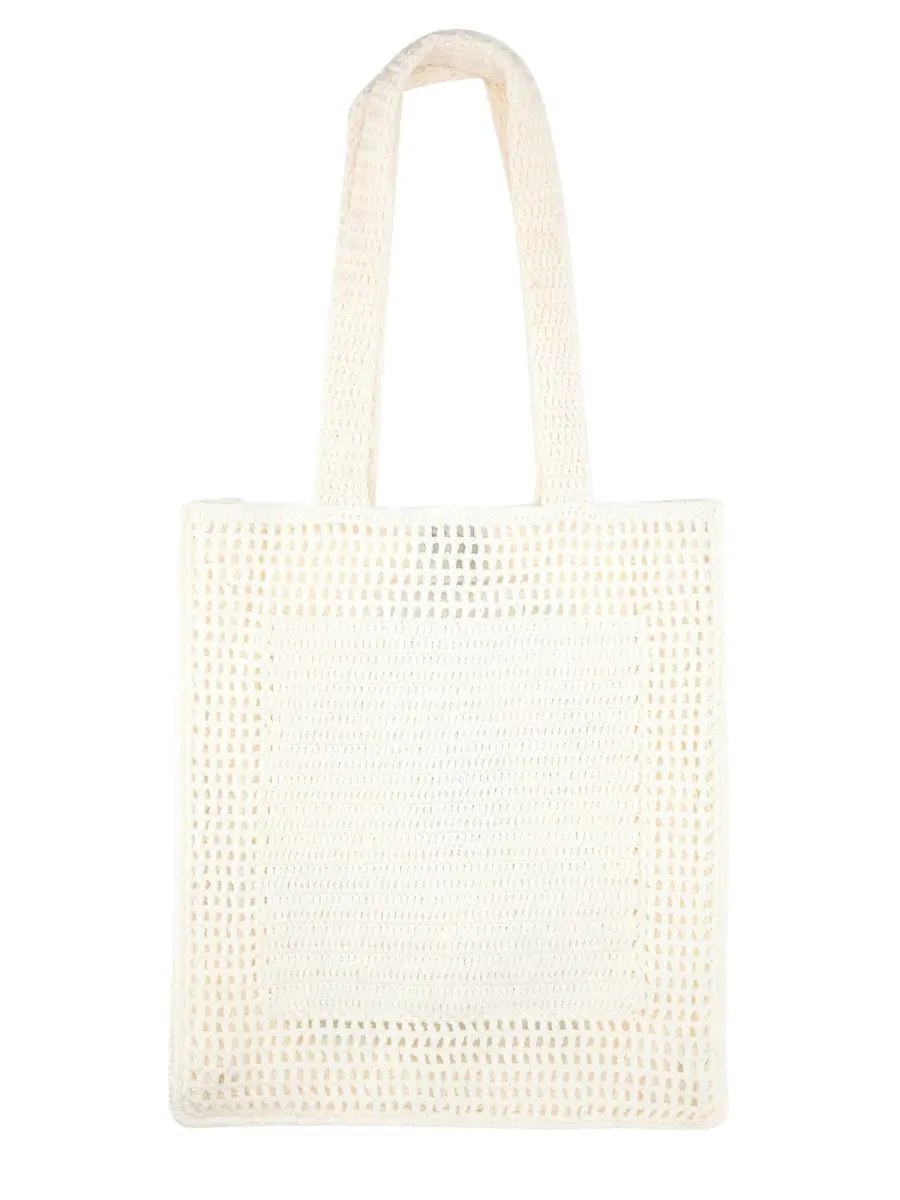 The motif crochet bag is a knitted style crafted from crochet cotton fabric and features a slouchy silhouette. Completed with an embroidered stacked logo, classic design elements, and straps that allow the tote style to be worn over the shoulder or in the hand.