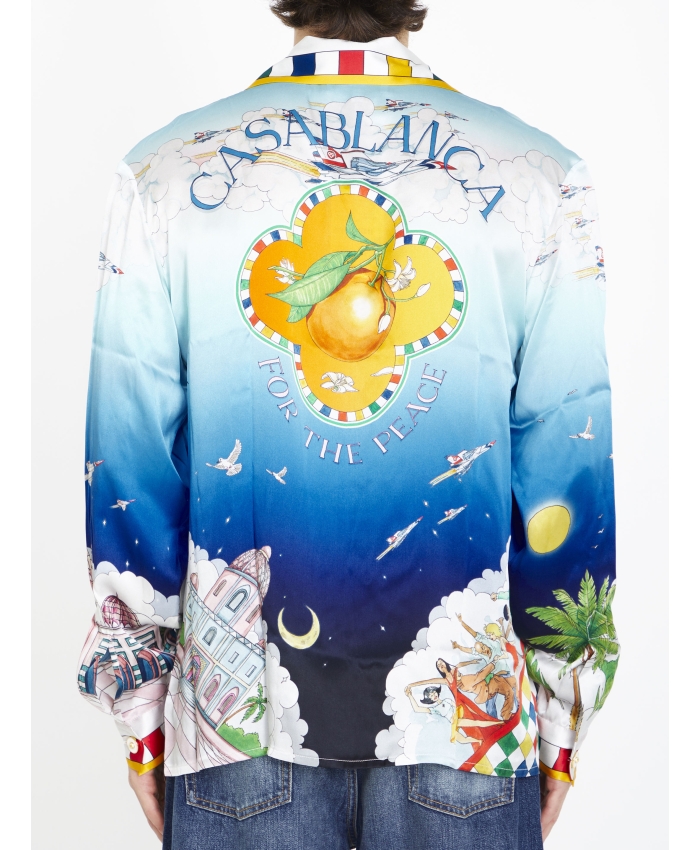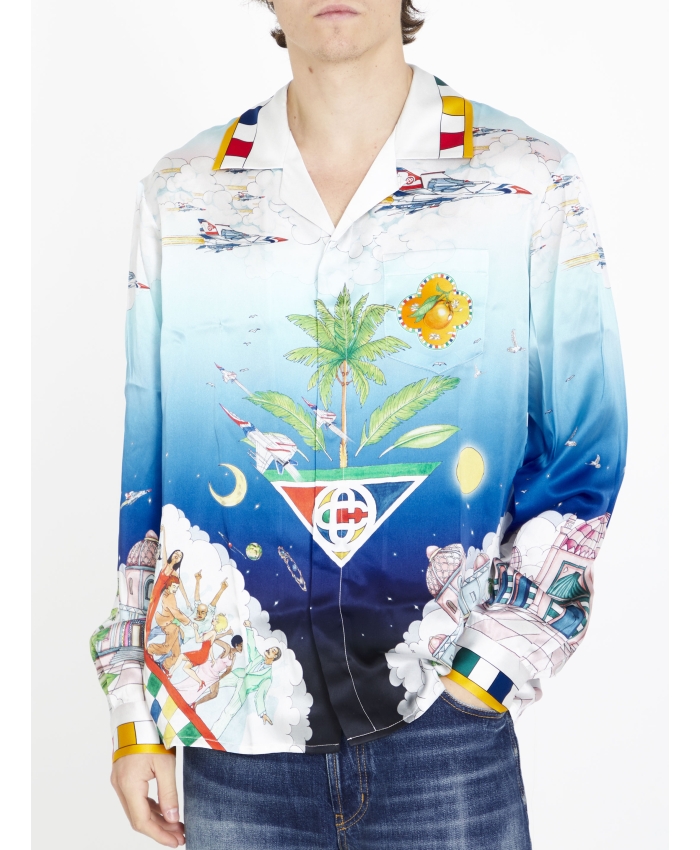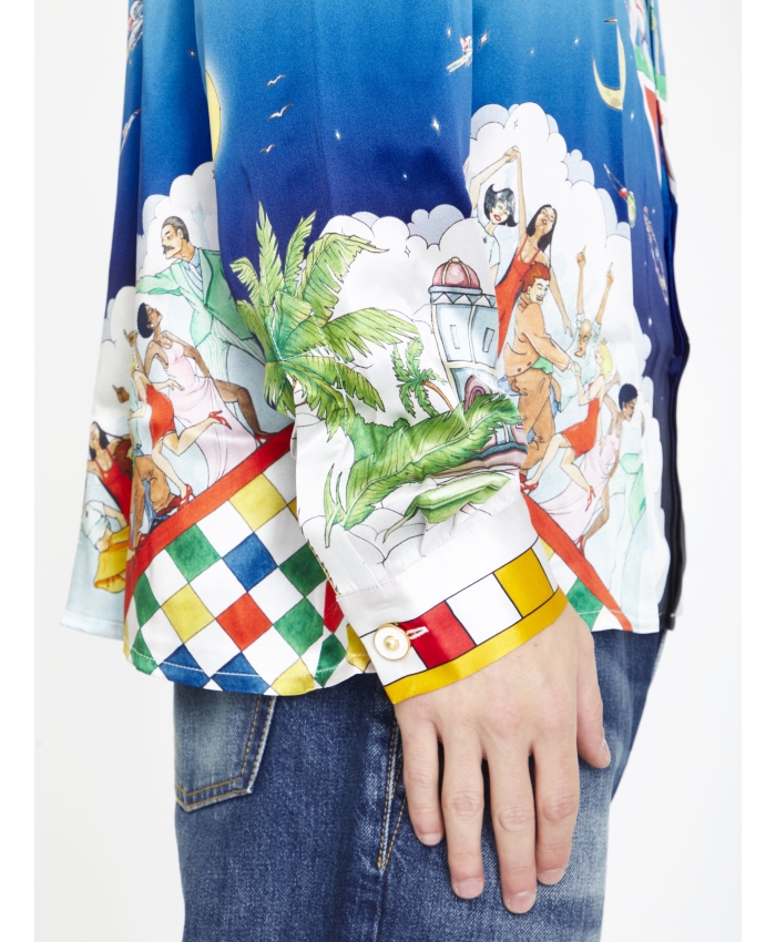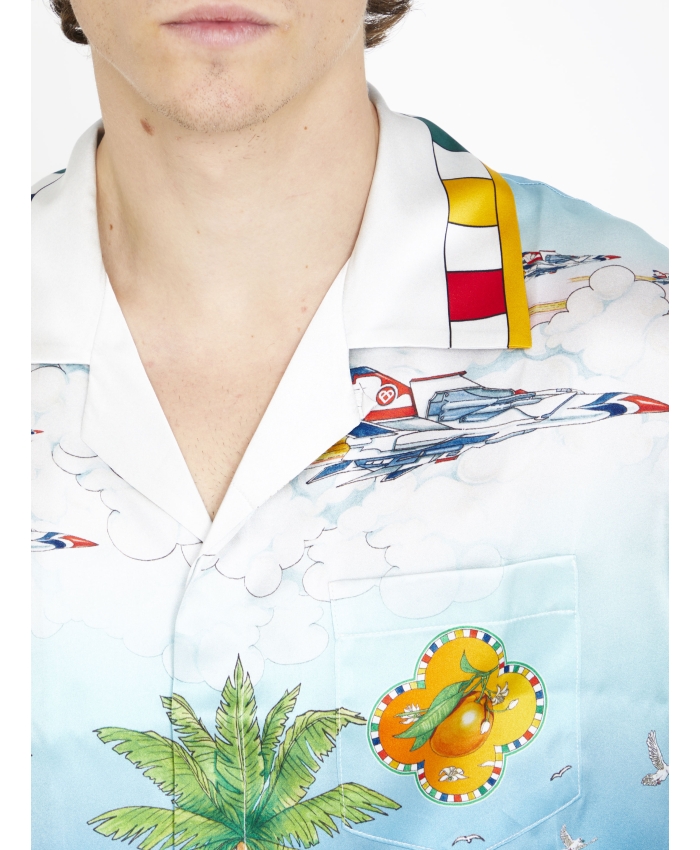 The Les Dimensions silk shirt is a printed short-sleeve style featuring Casablanca symbology with Arabic iconography. Finished with a collar, front button closure and signature gold rim pearl buttons, it has been designed for a classic fit. Printed silk twill fabric 100% silk Les Dimensions print multicolour Cuban collar Specialised dry clean only Made in Italy Unisex fit, take your regular size The model is 187cm/6’1 and is wearing a size M