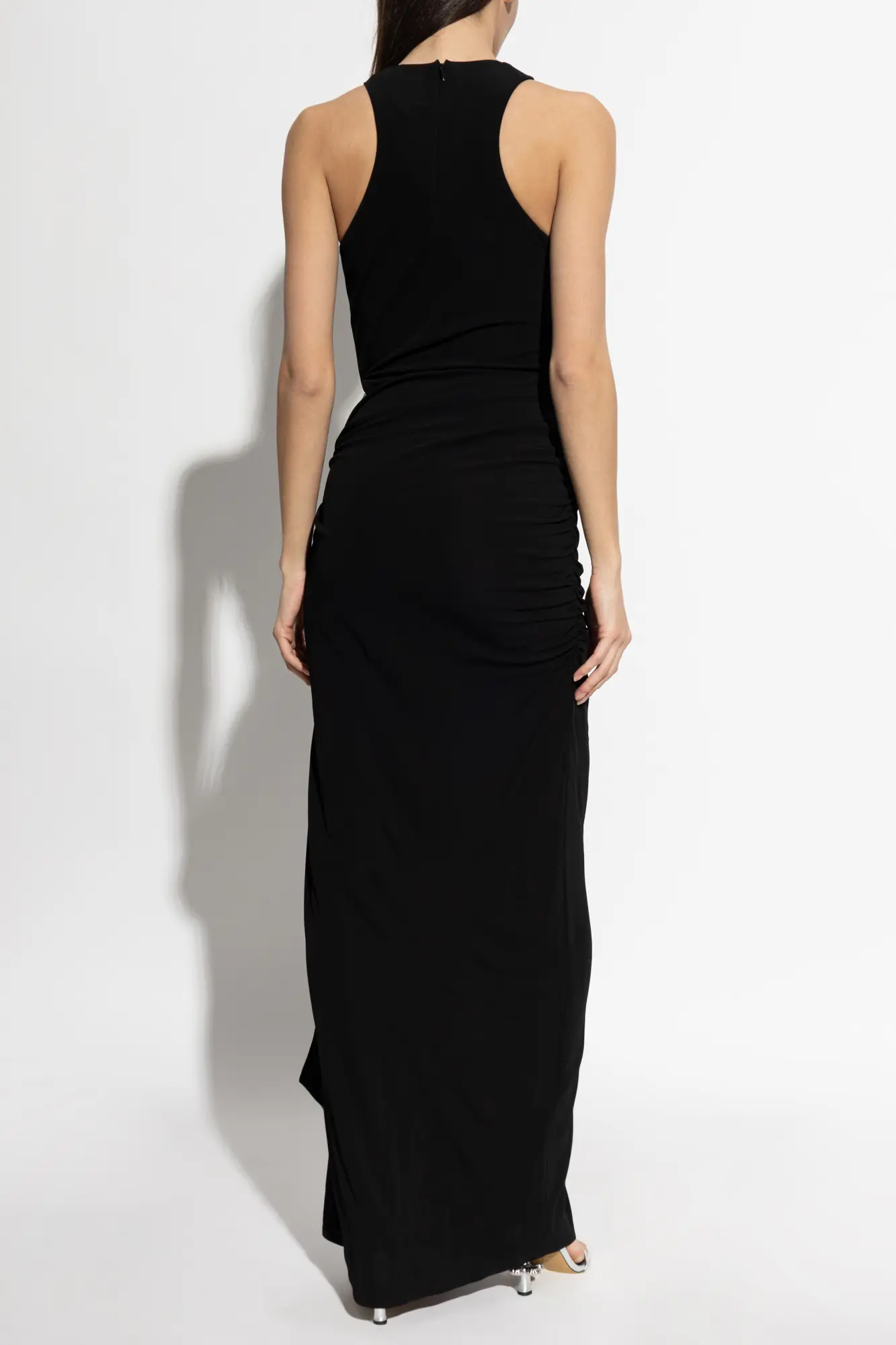 The Sleeveless Maxi Dress by Casablanca exudes modern sophistication. Presented in timeless black, this gown features a body-skimming silhouette with a defined waist and an elegant high halter neckline. Crafted from sumptuously smooth, resilient jersey knit, it drapes effortlessly to the floor while offering exceptional comfort and a fluid fit.