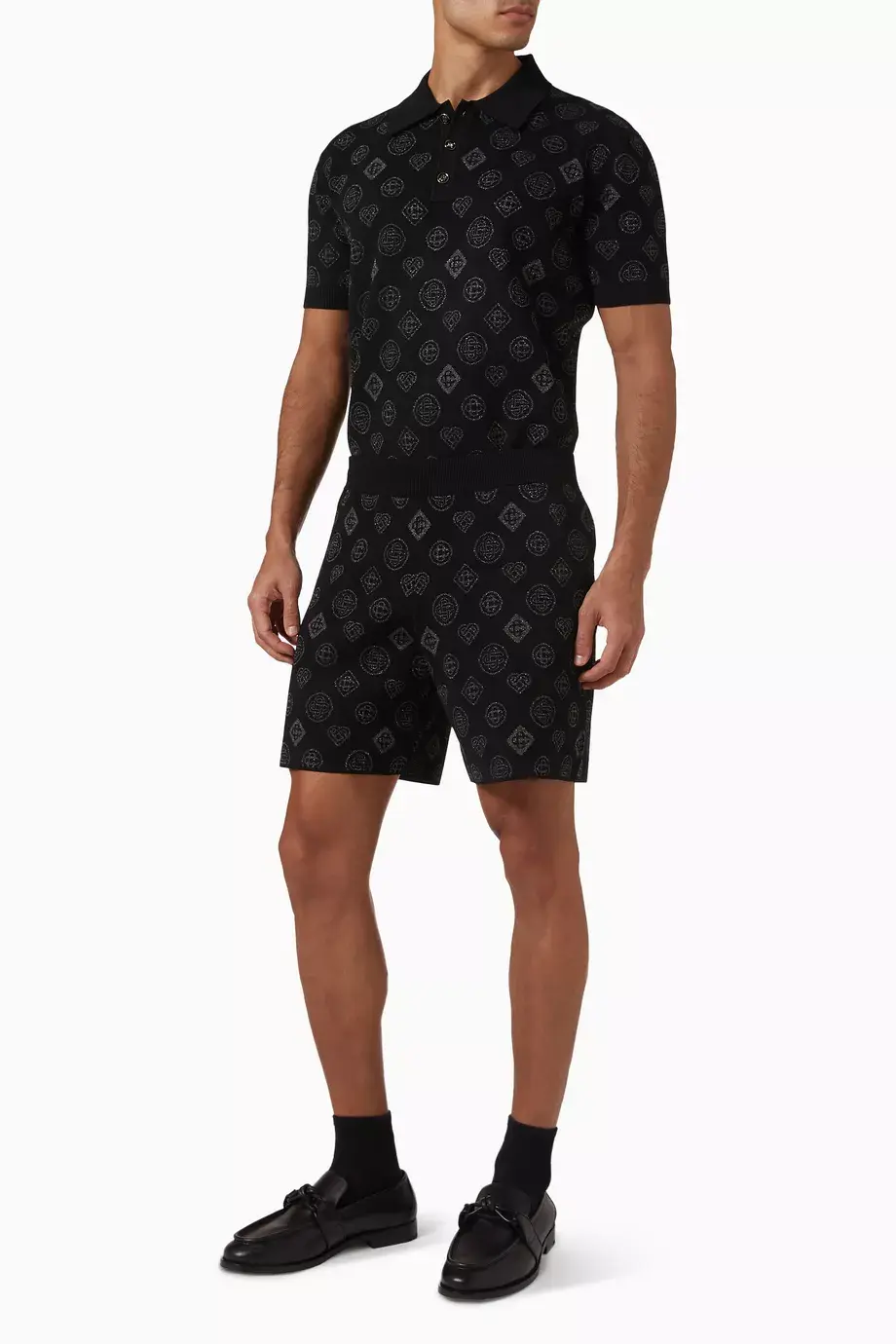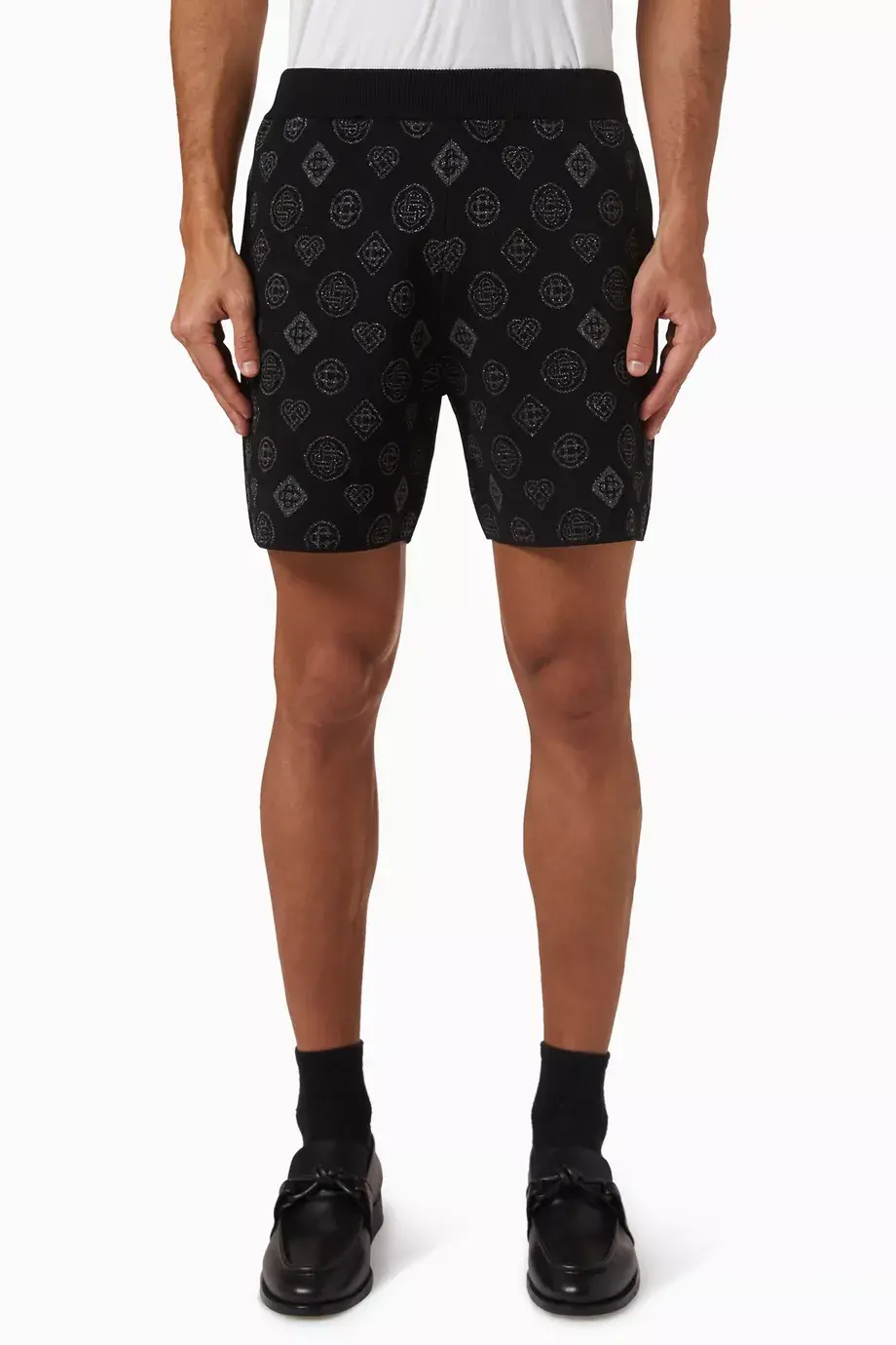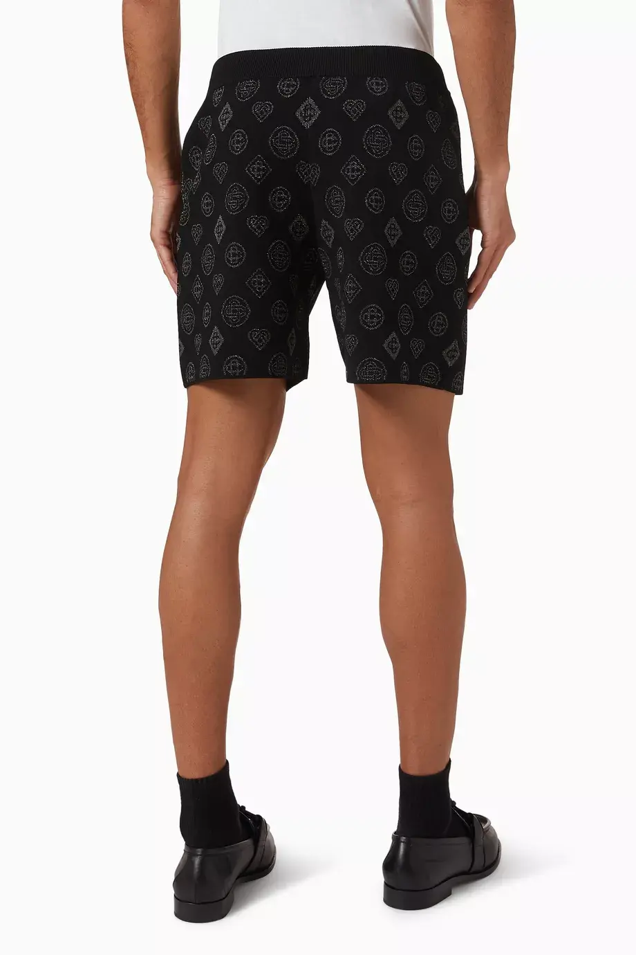 Bermuda shorts realized in stretch jacquard with lurex threads characterized by embroidered logo on the entire surface.