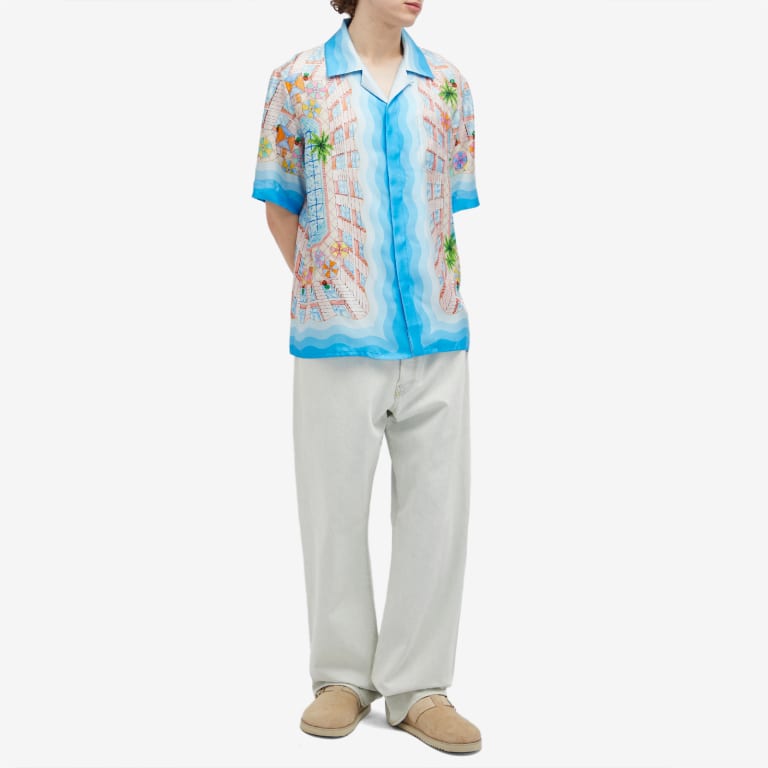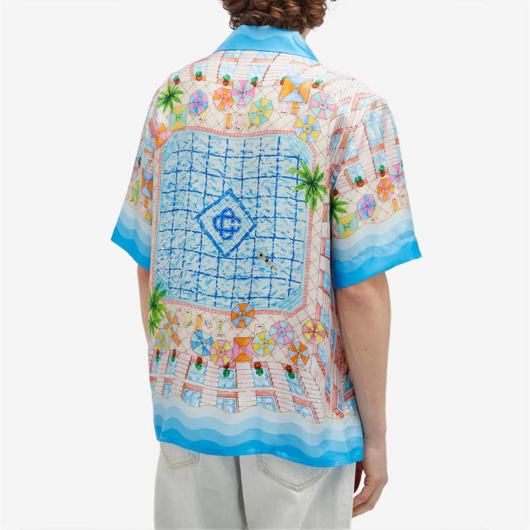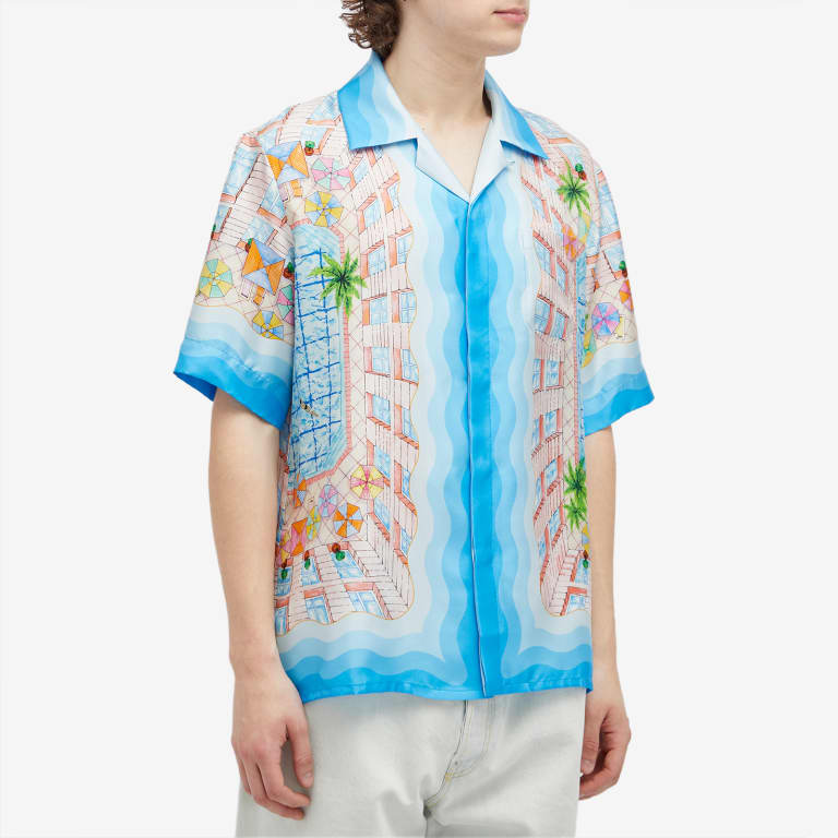 The Le Plongeon silk shirt is a short-sleeve printed style crafted from a silk twill fabric featuring seasonal artwork inspired by a beautiful day at the hotel's swimming pool and travel idealism viewed from above - giving a new perspective. The colour palette is light and idealistic, comprising soft pastel colours. Completed with a front button closure, Cuban collar, a breast pocket and contrast Memphis wave-inspired gradient stripe details on the cuffs, collar, hem and placket.