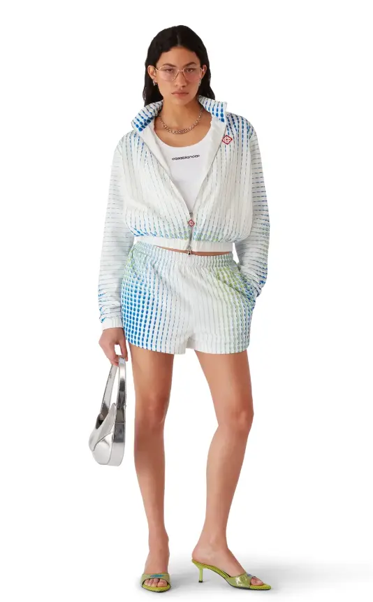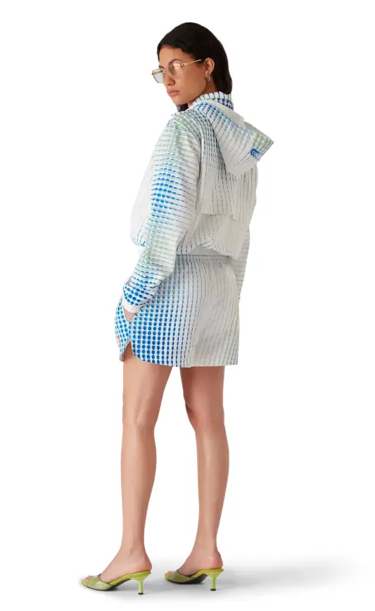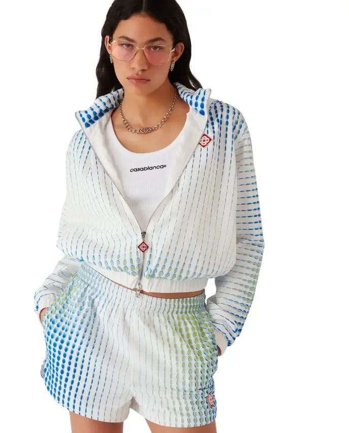 The Dots windbreaker jacket is a sportswear design crafted from a technical taffeta fabric with the house's signature artistry, featuring gradient motifs and texture effects. Completed with a long sleeve, a hood with drawstring fastening, elasticised cuffs and hem, a zip closure featuring the house's signature diamond zipper tab, and the house's diamond logo.