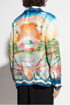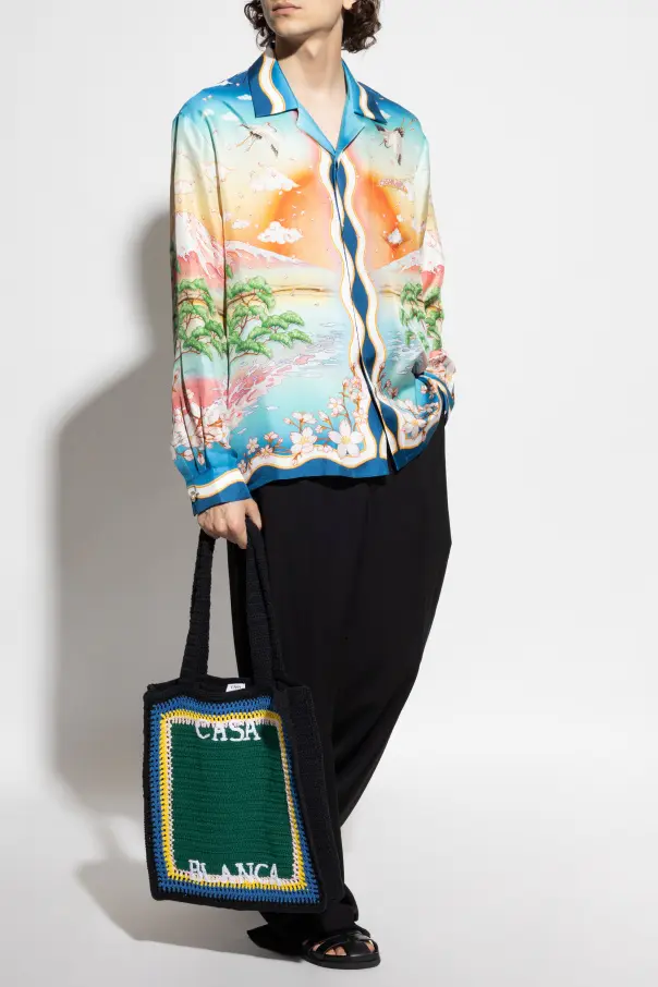 Embrace refined sophistication with the Silk Shirt by Casablanca, a visionary creation crafted in luminous, premium silk. This relaxed, camp-collar silhouette radiates effortless elegance, enveloping you in featherlight luxury and distinguished comfort. The shirt captivates with an expressive, hand-painted multicolor print—vivid blues, sunlit oranges, greens, and creamy hues—depicting an evocative dawn landscape with clouds, sakura blossoms, tranquil water, and serene birds, blending artistic flair with exotic allure.
