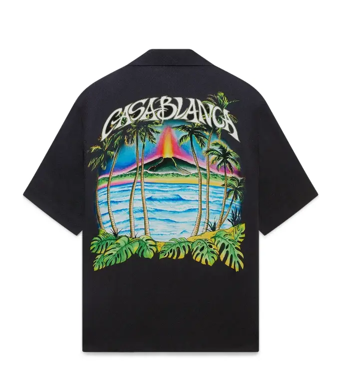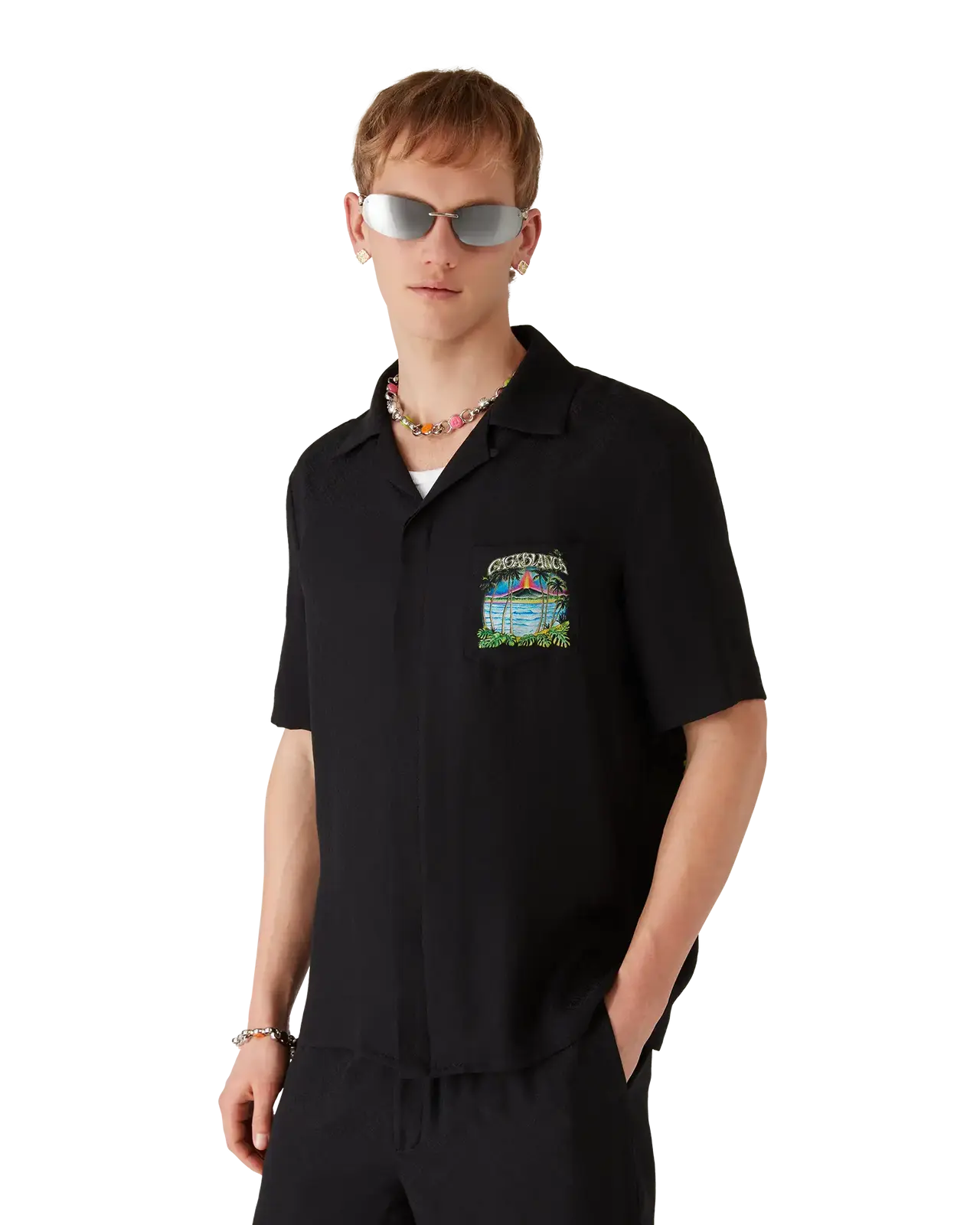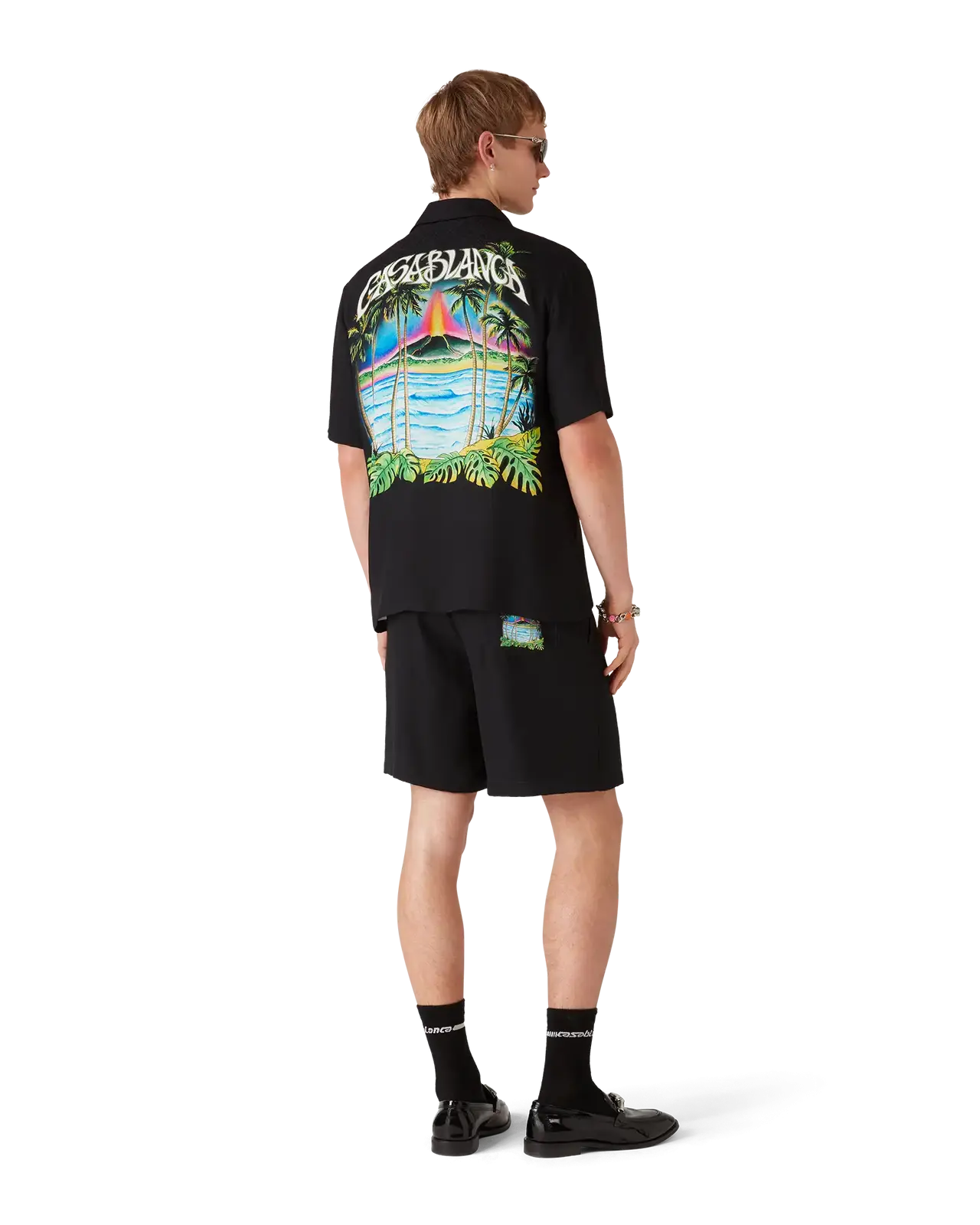 The Volcano short-sleeve shirt is a silk design featuring a volcano looming dramatically behind half-silhouetted palm trees, mid-eruption, its fiery energy contrasting sharply with the serene, tranquil scene in the foreground. Completed with a breast pocket, button closure, interlocking CC logo corozo buttons, and signature detailing that embodies the brand's sophisticated approach to luxury shirting.