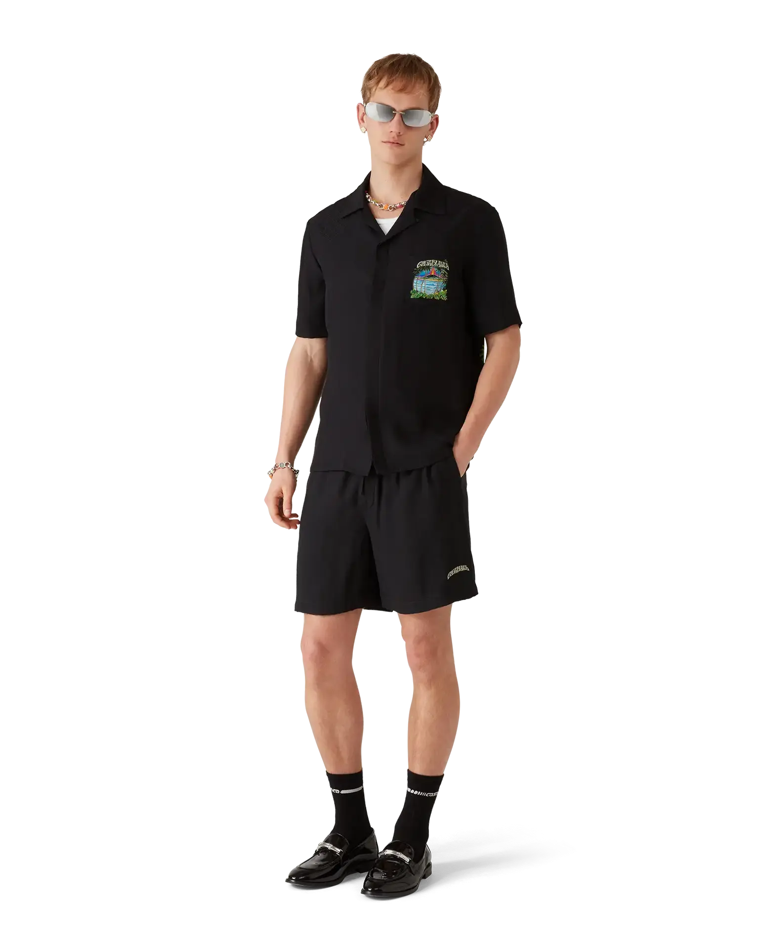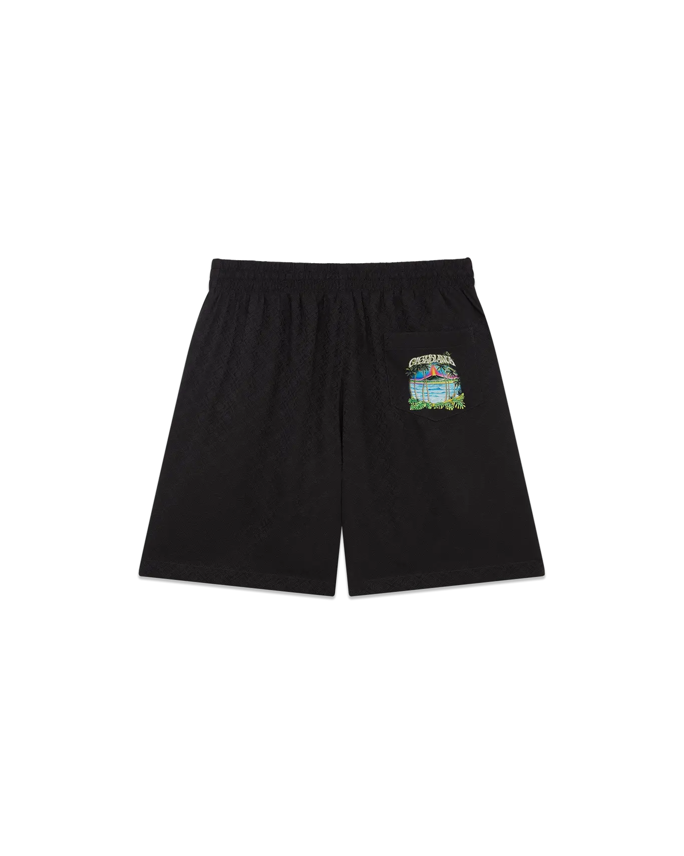 The Volcano silk shorts are a refined design featuring the season's artwork of a volcano looming dramatically behind half-silhouetted palm trees, mid-eruption, its fiery energy contrasting sharply with the serene, tranquil scene in the foreground. Completed with an elasticised waistband, drawstring fastening, in-seam side pockets, a back patch pocket, and a relaxed silhouette that captures the brand's luxury approach to casualwear.
