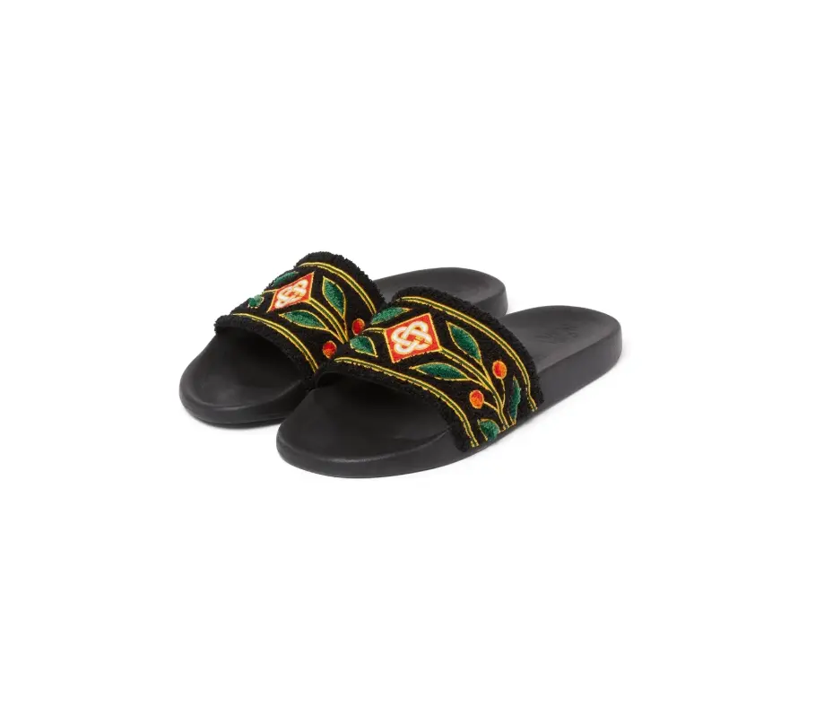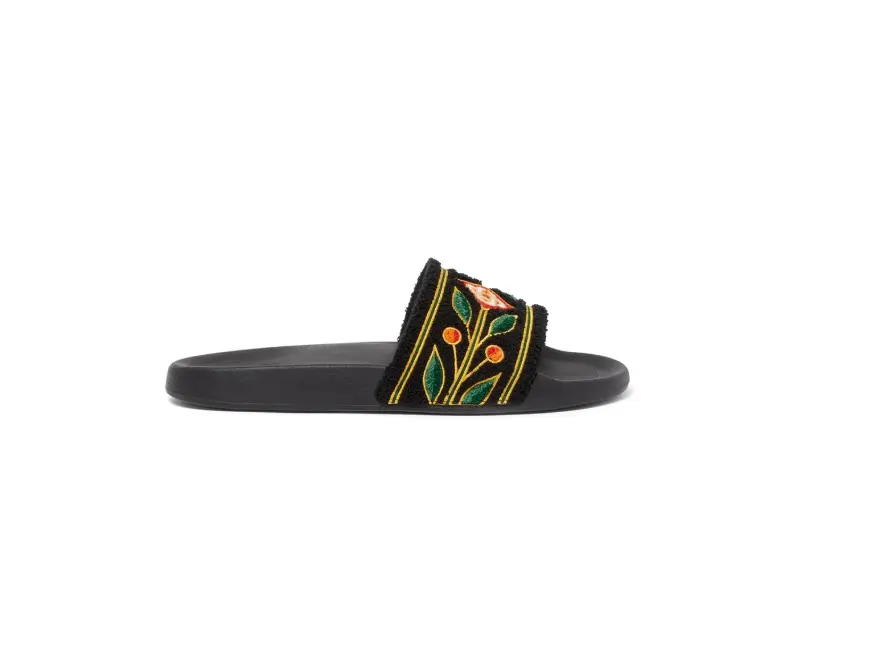 The Laurel terry slides are crafted from terry fabric and feature the house's diamond logo and signature Laurel artwork on its uppers. Completed with a sculpted footbed for elevated comfort and a textured rubberised sole that blends performance with leisure.