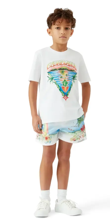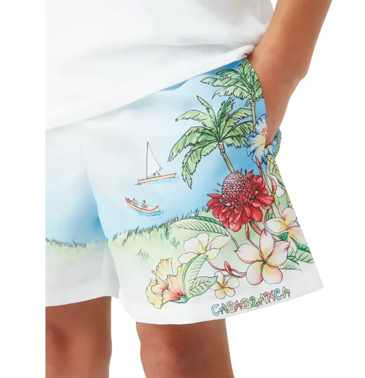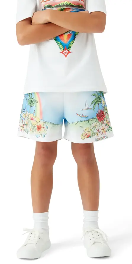 The Children's Gradient Swimwear feature a vibrant, painted depiction of Kauai, Hawaii, presenting its mountainous paradise, waterfalls, playful dolphins, canoes, and a rainbow, with an exaggerated view of the landscape's beauty. Completed with an elasticised waistband, drawstring fastening, a lining, and side pockets.