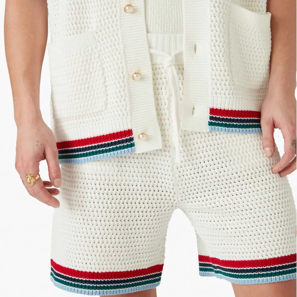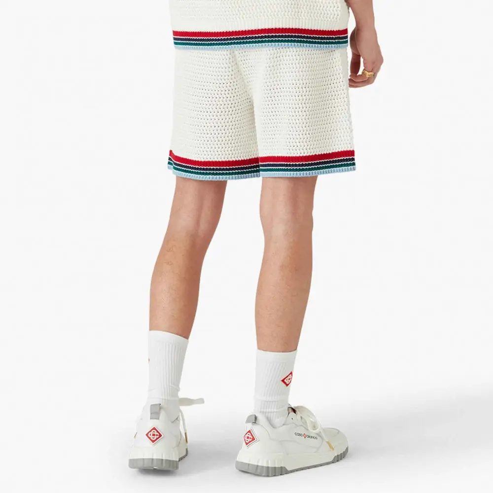 The Gothic crochet shorts are a soft textured design crafted from knitted cotton fabric, featuring the house's signature diamond logo. Finished with a ribbed elasticated waistband with drawstring fastening, side pockets, and contrast stripe detail on the legs.