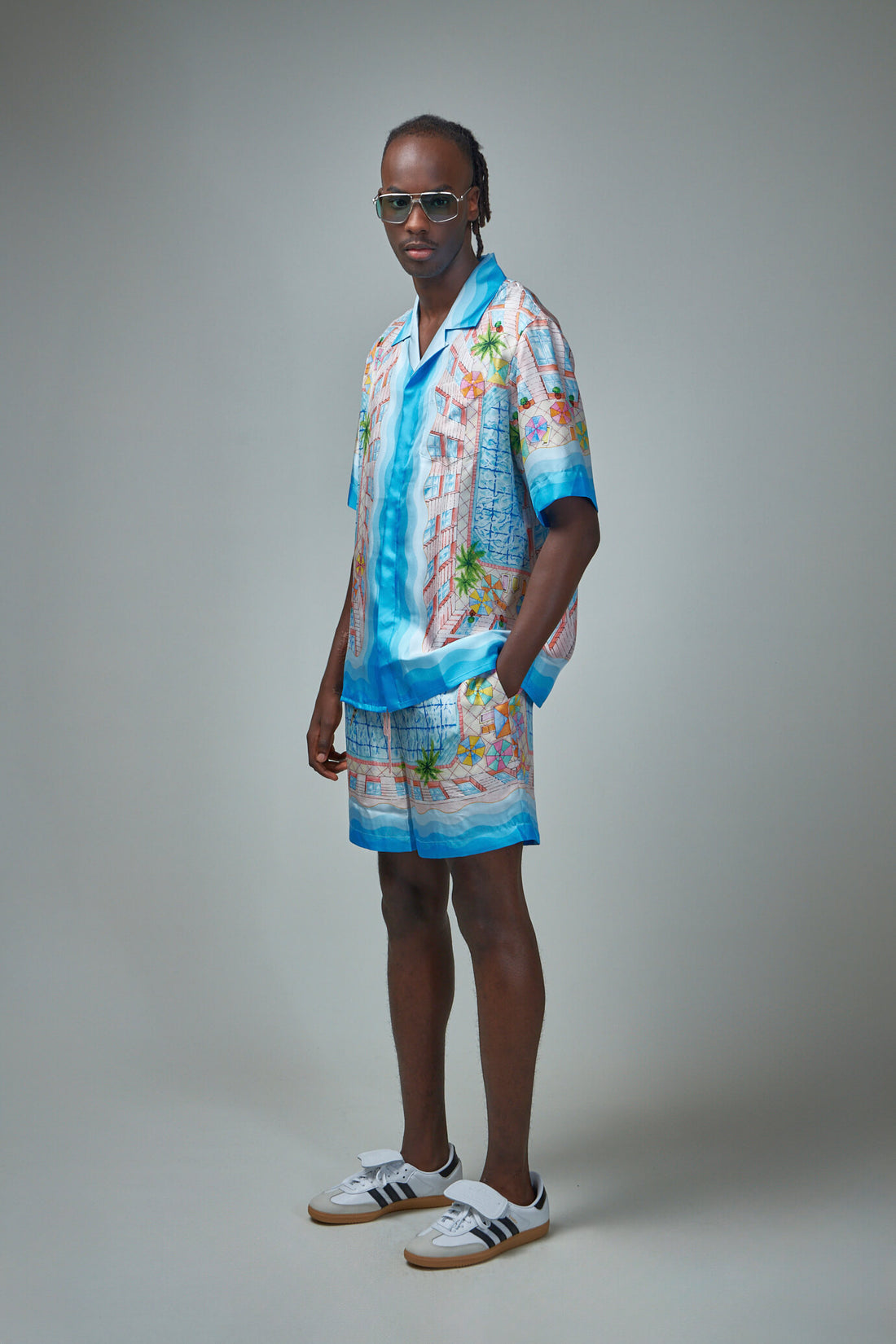 The Le Plongeon silk shorts are a familiar design crafted from printed silk twill fabric and feature seasonal artwork inspired by a beautiful day at the hotel's swimming pool and travel idealism viewed from above - giving a new perspective. The colour palette is light and idealistic, comprising soft pastel colours. Completed with an elasticated waistband with drawstring fastening, side pockets, a back pocket and contrast Memphis wave-inspired gradient stripe details on the hem.