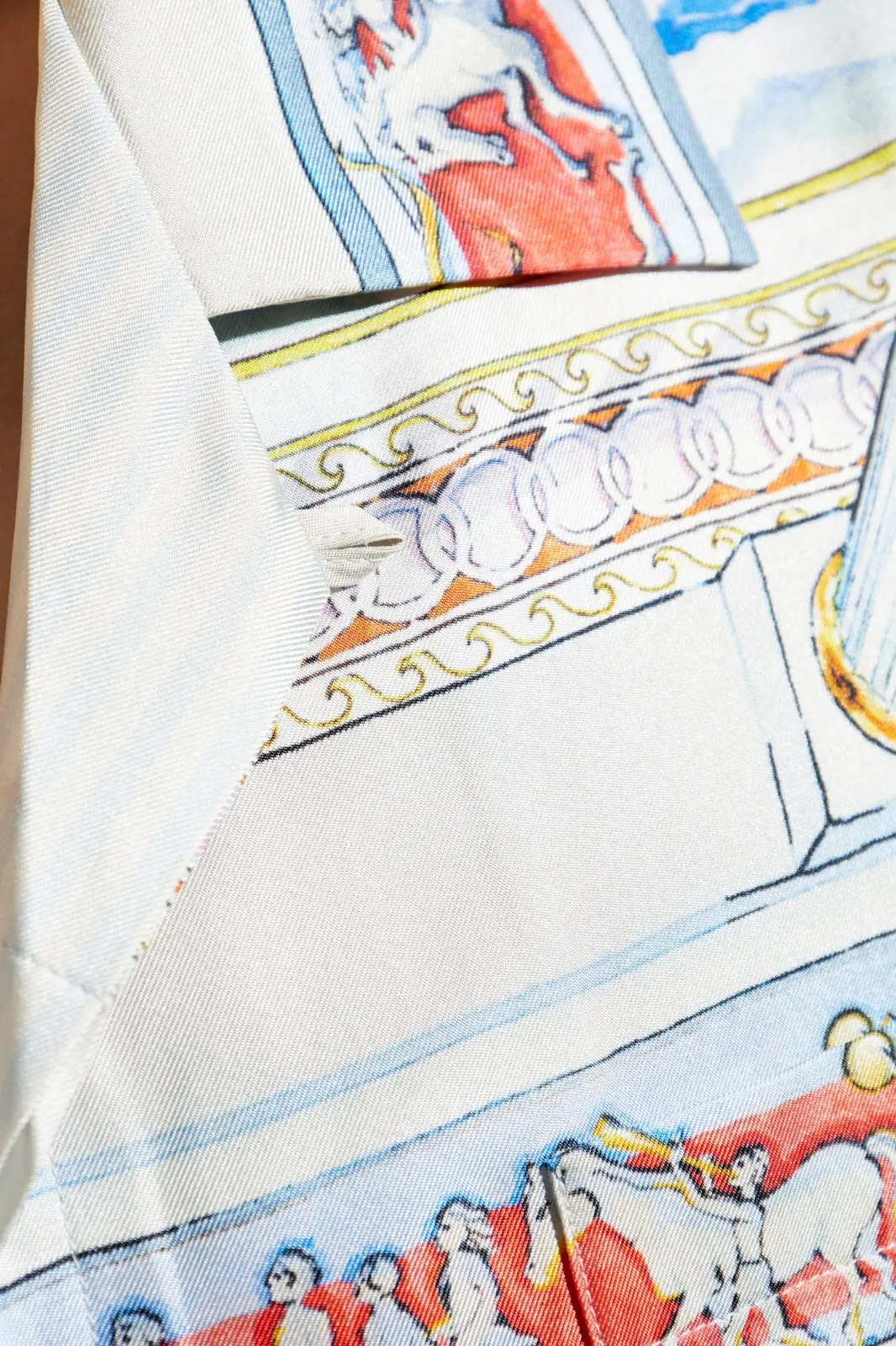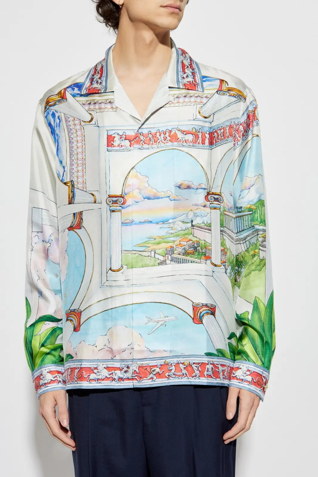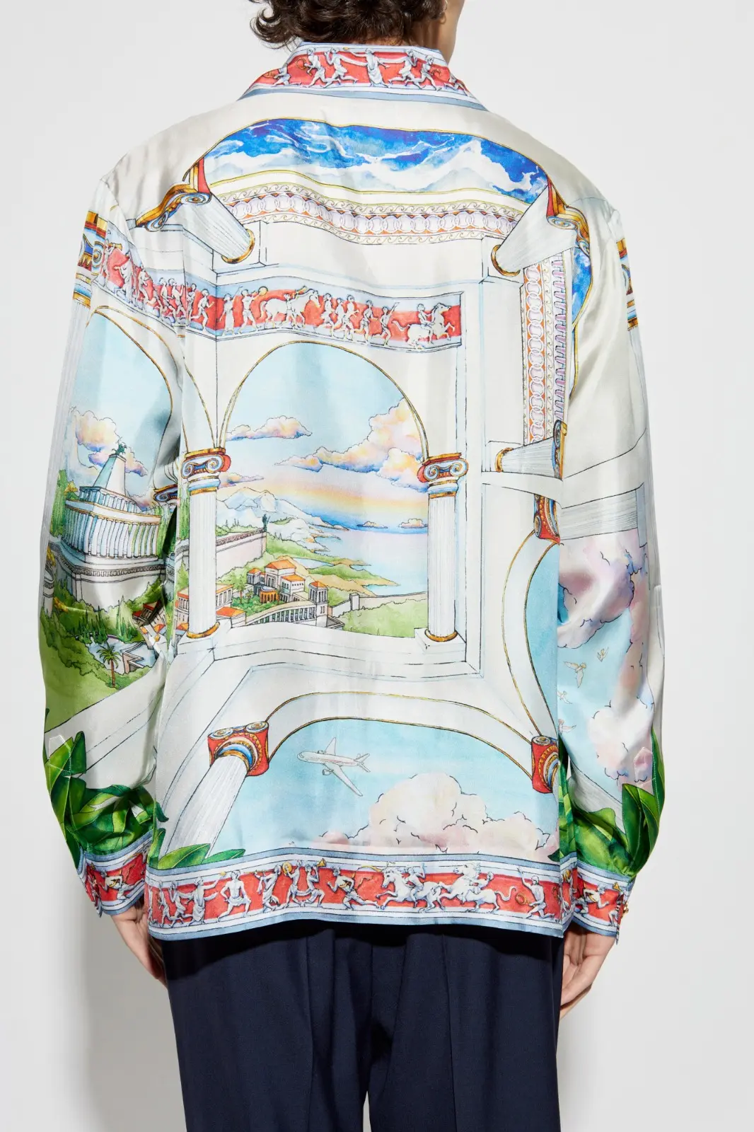 Introducing the silk shirt by Casablanca, which epitomizes refined elegance and artistic expression. This shirt, crafted from the highest quality silk, features a captivating multicolored pattern depicting architectural motifs of ancient columns and arches, complemented by landscapes and classic details.