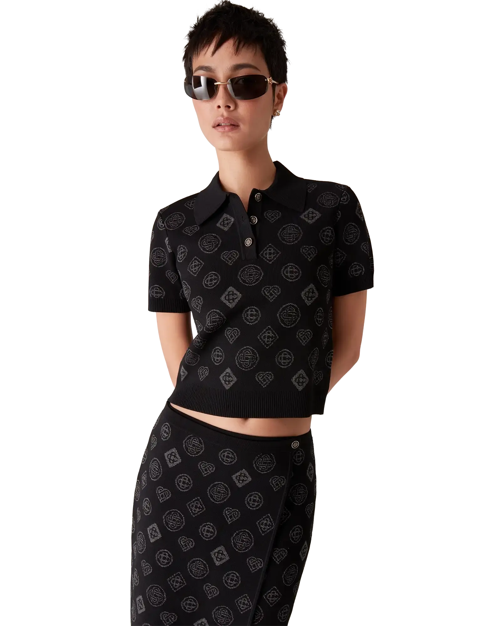 The monogram jacquard polo is a short-sleeve design featuring the house's Honeydew logo repeat artwork. This repeat differs from our other monograms, as it combines unique shapes to form a cohesive pattern. It is more of an icon-based design. Completed with button closure, signature interlocking CC logo gold-plated buttons, a rib collar, cuffs, and hem.