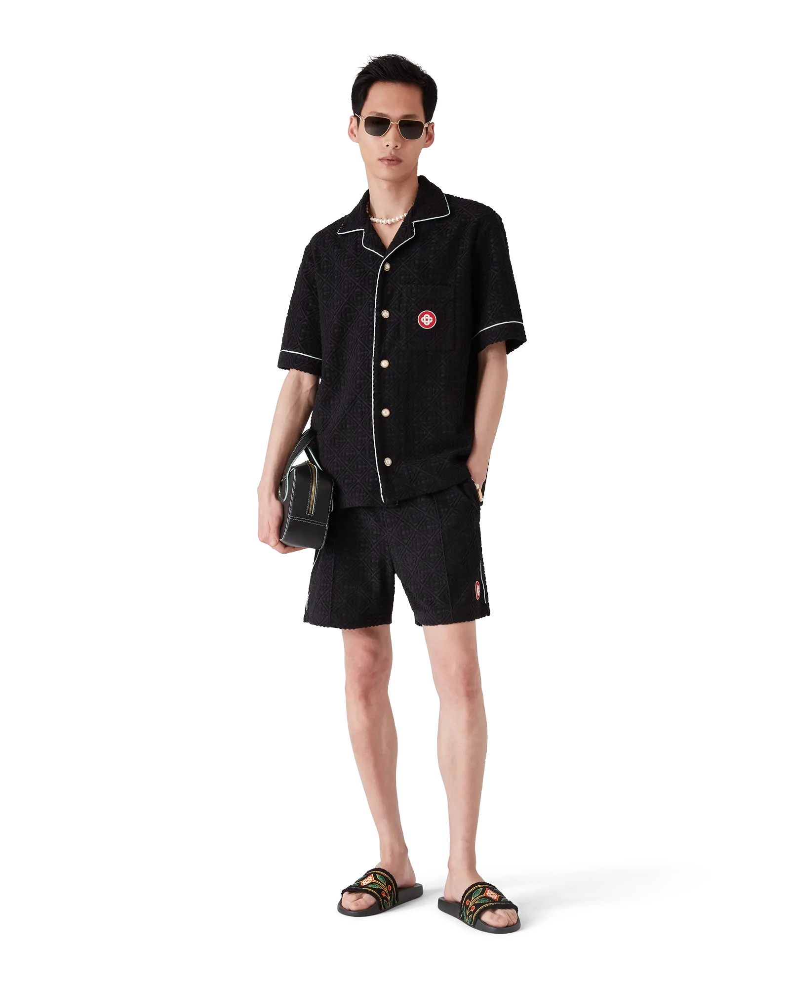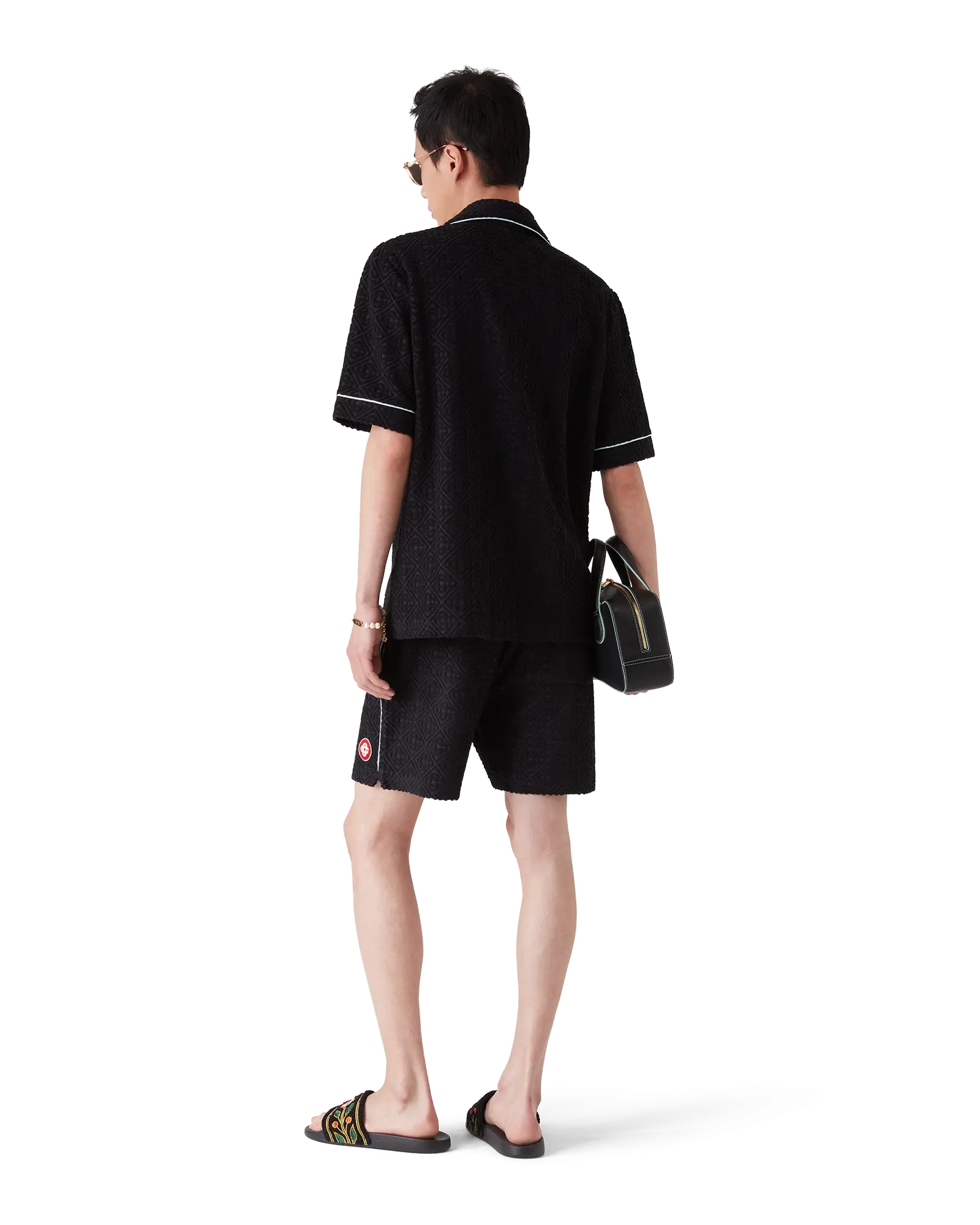 The Monogram towelling shorts are a classic design crafted from a monogram towelling fabric. Completed with an elasticated waistband, gold-tipped drawstring fastening, pin tuck seams down the front, a back pocket with zip closure, slanted side pockets, and piping details on the back and front pockets and down the sides.